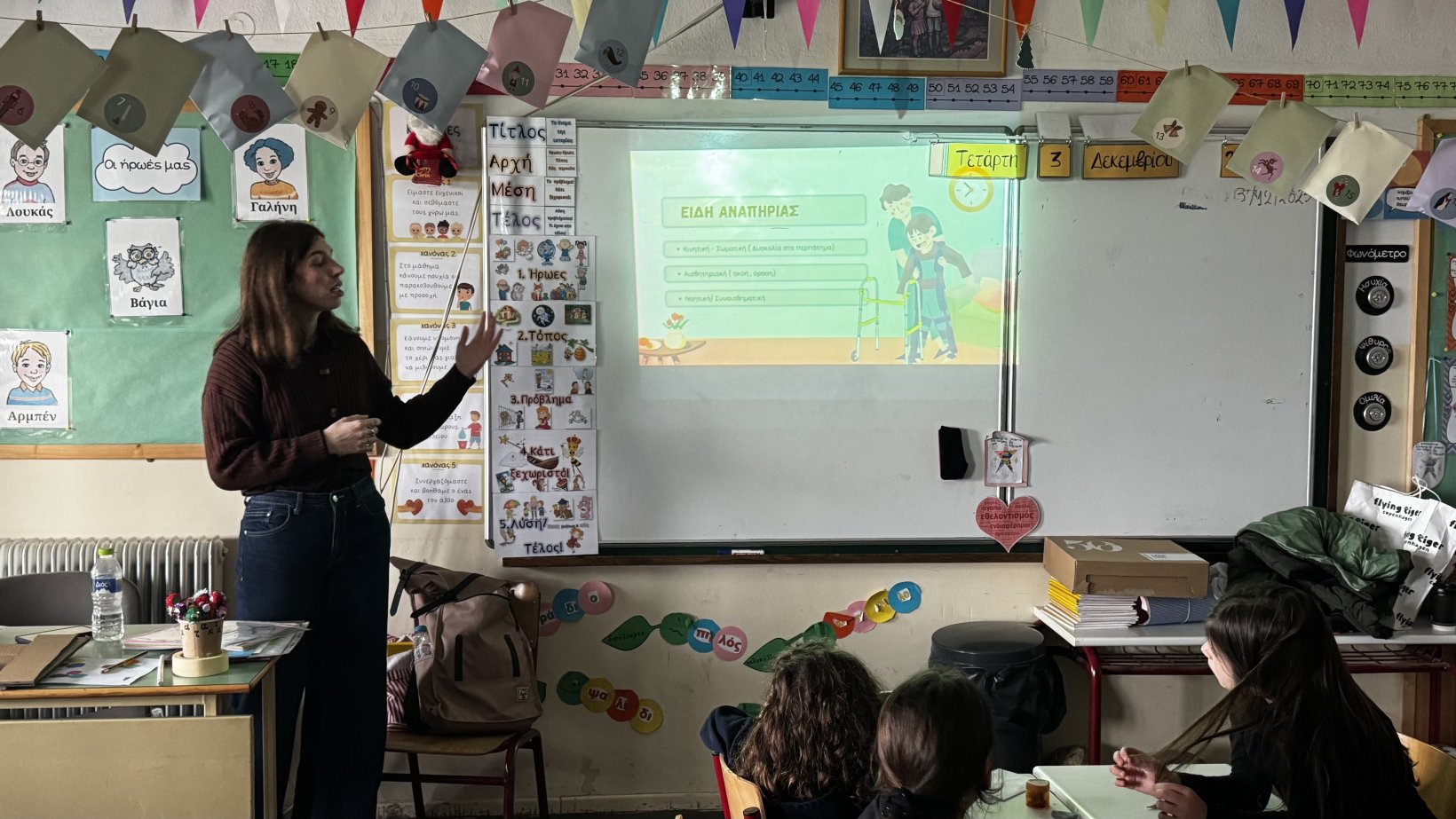 Η κυρία Αναστασία Σιδερίδου, εκπαιδευτικός Ειδικής Αγωγής στο σχολείο μας, εξήγησε στα παιδιά τι είναι αναπηρία, έπαιξε παιχνίδια μαζί τους, πρόβαλε παρουσίαση και βίντεο σε ψηφιακή μορφή, ενώ δίνοντας ιδιαίτερη έμφαση στην κώφωση, παρουσίασε στα παιδιά το αλφάβητο της νοηματικής γλώσσας, δίνοντας παραδείγματα λέξεων και φράσεων. Ζήτησε στη συνέχεια να αναπαραστήσουν το αρχικό γράμμα του ονόματός τους. Στο τέλος τα παιδιά ζωγράφισαν σχετική εικόνα που στη νοηματική γλώσσα σηματοδοτεί την αγάπη.