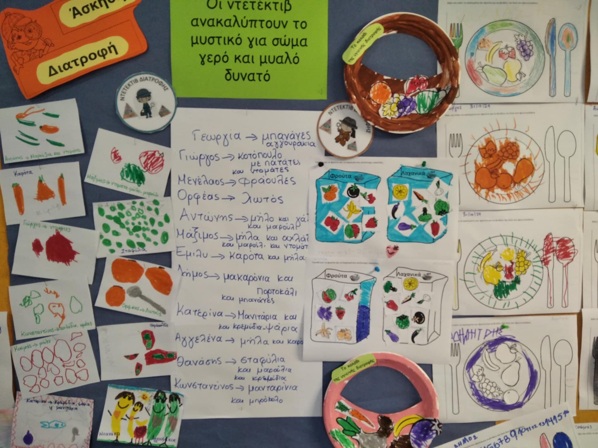 Ολοκληρώσαμε το 1ο Εργαστήριο Δεξιοτήτων με τίτλο: “Οι ντετέκτιβ ανακαλύπτουν το μυστικό για σώμα γερό και μυαλό δυνατό”, από τη θεματική ενότητα: Ζω καλύτερα-Ευ ζην, Υποθεματική: Υγεία-Διατροφή και Άσκηση. Μάθαμε για την υγιεινή διατροφή μέσα από την Πυραμίδα της Μεσογειακής Διατροφής και για τη σημασία της σωματικής άσκησης μέσα από την Πυραμίδα της Φυσικής Δραστηριότητας. Καταγράψαμε τις διατροφικές μας συνήθειες και τις δραστηριότητες άσκησής μας. Δοκιμάσαμε φρούτα της εποχής και συζητήσαμε για τα λαχανικά, τα φρούτα και τη διατροφική τους αξία. Επισκέφτηκε το σχολείο μας παιδίατρος και μας μίλησε για τις ωφέλιμες τροφές και τη σωστή διατροφή.