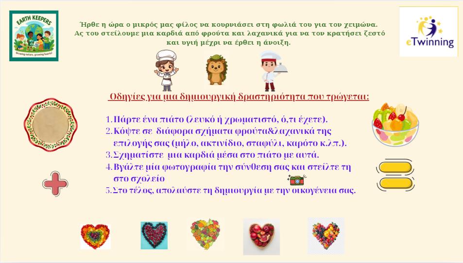 Με ένα ειδικό μήνυμα, οι οικογένειες προσκλήθηκαν να δημιουργήσουν στο σπίτι μια καρδιά από φρούτα και λαχανικά, ως σύμβολο αγάπης και υγιεινής διατροφής για τον EcoLino τον χειμώνα.