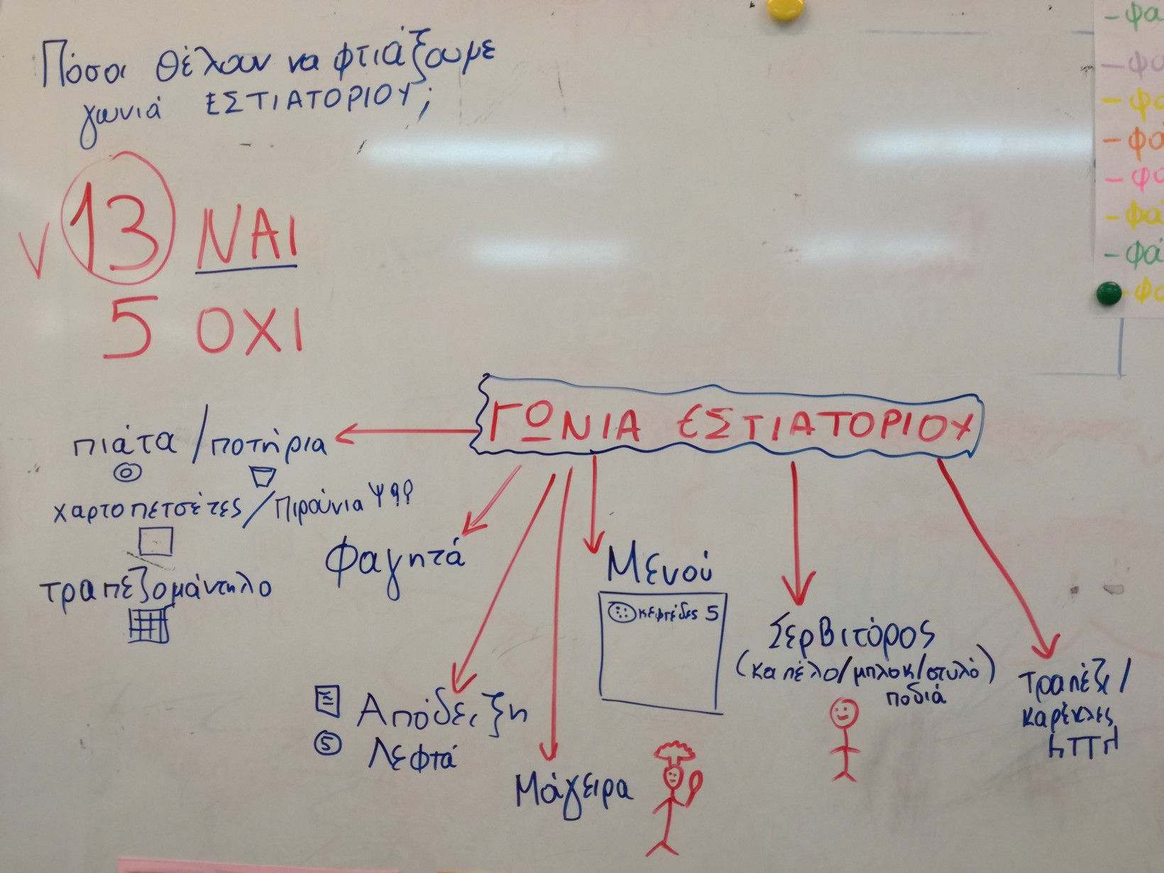 Στην ιδέα της νηπιαγωγού για τη δημιουργία μιας Γωνιάς Εστιατορίου στην τάξη μας, η πλειοψηφία συμφώνησε: 13 ΝΑΙ και 5 ΟΧΙ και με δημοκρατικές διαδικασίες επιλέχθηκε και το όνομα του εστιατορίου μας: