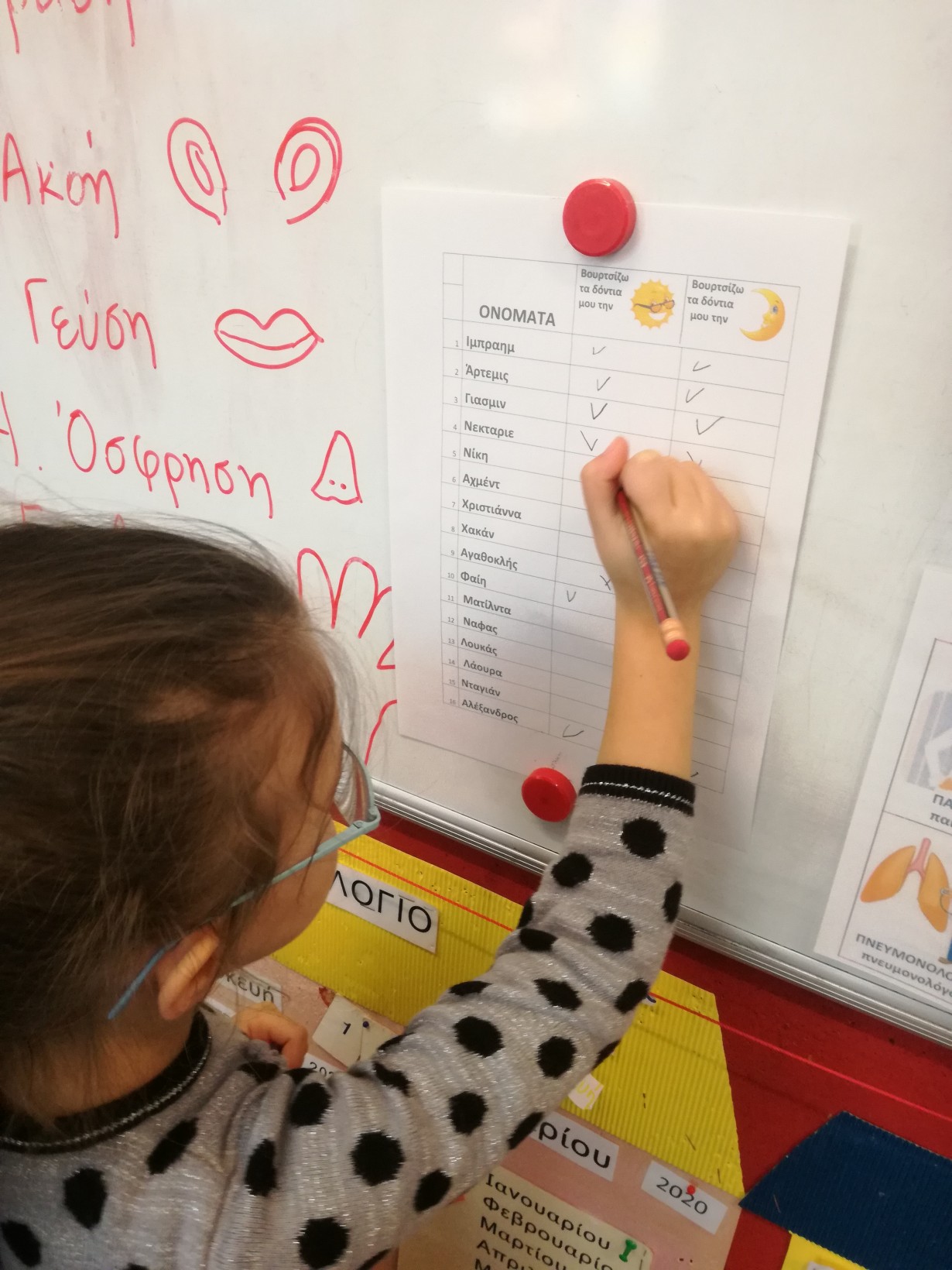 Αρχικά συζητήσαμε για τα δοντάκια μας ,τις επισκέψεις μας στον οδοντίατρο και τις τροφές που πρέπει να αποφεύγουμε για να έχουμε δυνατά δοντάκια. Ο καθένας είπε την εμπειρία του και μας ήρθε η ιδέα να μετρήσαμε πόσοι είναι αυτοί που δεν ξεχνούν τον βασικό κανόνα υγιεινής: πλύσιμο δοντιών 2 φορές την ημέρα, πρωί και βράδυ! Έτσι, συμπληρώσαμε στην παρεούλα έναν πίνακα διπλής εισόδου, όπου αριστερά εντόπιζε ο καθένας το όνομά του και τσέκαρε με v ή x αν τα έπλενε ή δεν τα έπλενε, αντίστοιχα, τόσο το πρωί όσο και το βράδυ. Δυο μόνο ήταν αυτοί που παραδέχτηκαν πως ξεχνούσαν να πλένουν τα δοντάκια τους καθημερινά, ενώ όλοι οι άλλοι δήλωσαν πως τηρούσαν πάντα τον κανόνα. Δυστυχώς, όμως, τα στατιστικά αποτελέσματα της μέτρησής μας δεν ταίριαζαν με τα ευρήματα της οδοντογιατρού στη συνέχεια, αφού αρκετά χαλασμένα δοντάκια εντοπίστηκαν! Προσοχή παιδιά!