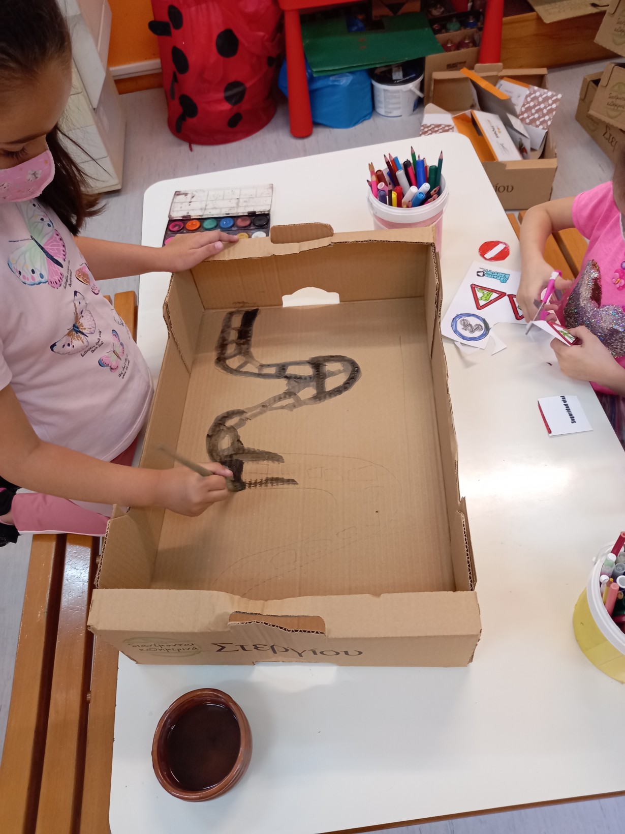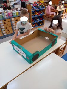 Και φυσικά το επόμενο στάδιο είναι να φτιάξουμε τα δικά αυτοκίνητα ανά ομάδες! Πήραμε τις κούτες από το πρόγραμμα σίτισης, τις βάψαμε με τέμπερες, κόψαμε μόνοι και κολλήσαμε ρόδες, φώτα, πινακίδες με τα γράμματα και τους αριθμούς, βάλαμε σε κάποια και εξάτμιση από ρολό υγείας. Έτοιμα τα οχήματά μας!