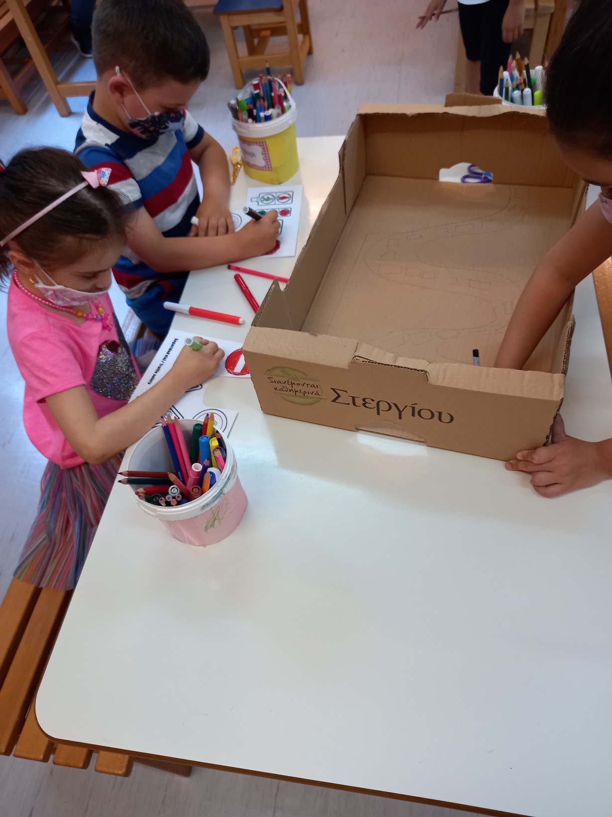 Τον τελευταίο καιρό τα παιδιά χρησιμοποιούν στην αυλή τις κούτες από το πρόγραμμα σίτισης που έχουμε φέτος στο νηπιαγωγείο και παίζουν “αυτοκινητάκια”. Έτσι, προέκυψε το ενδιαφέρον των παιδιών για τα αυτοκίνητα και για τα σήματα στον δρόμο. Αρχικά διαβάσαμε βιβλία από τη βιβλιοθήκη μας με θέμα την κυκλοφοριακή αγωγή