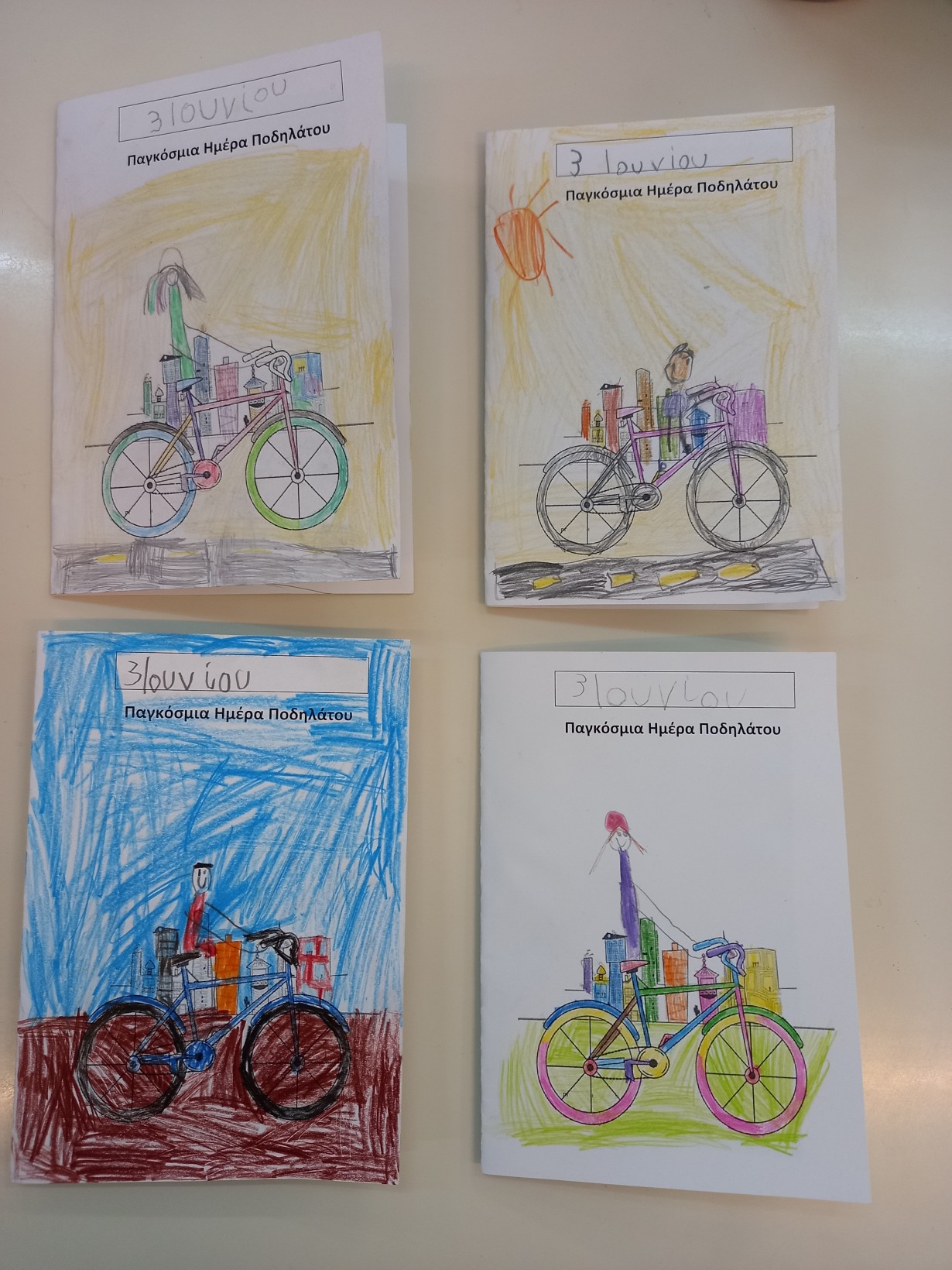 Για εξώφυλλο χρωματίσαμε ένα ποδήλατο και ζωγραφίσαμε τον εαυτό μας ως ποδηλάτη! Μέσα κολλήσαμε το φυλλάδιο με τους κανόνες και γράψαμε 3 ΙΟΥΝΙΟΥ παγκόσμια ημέρα ποδηλάτου