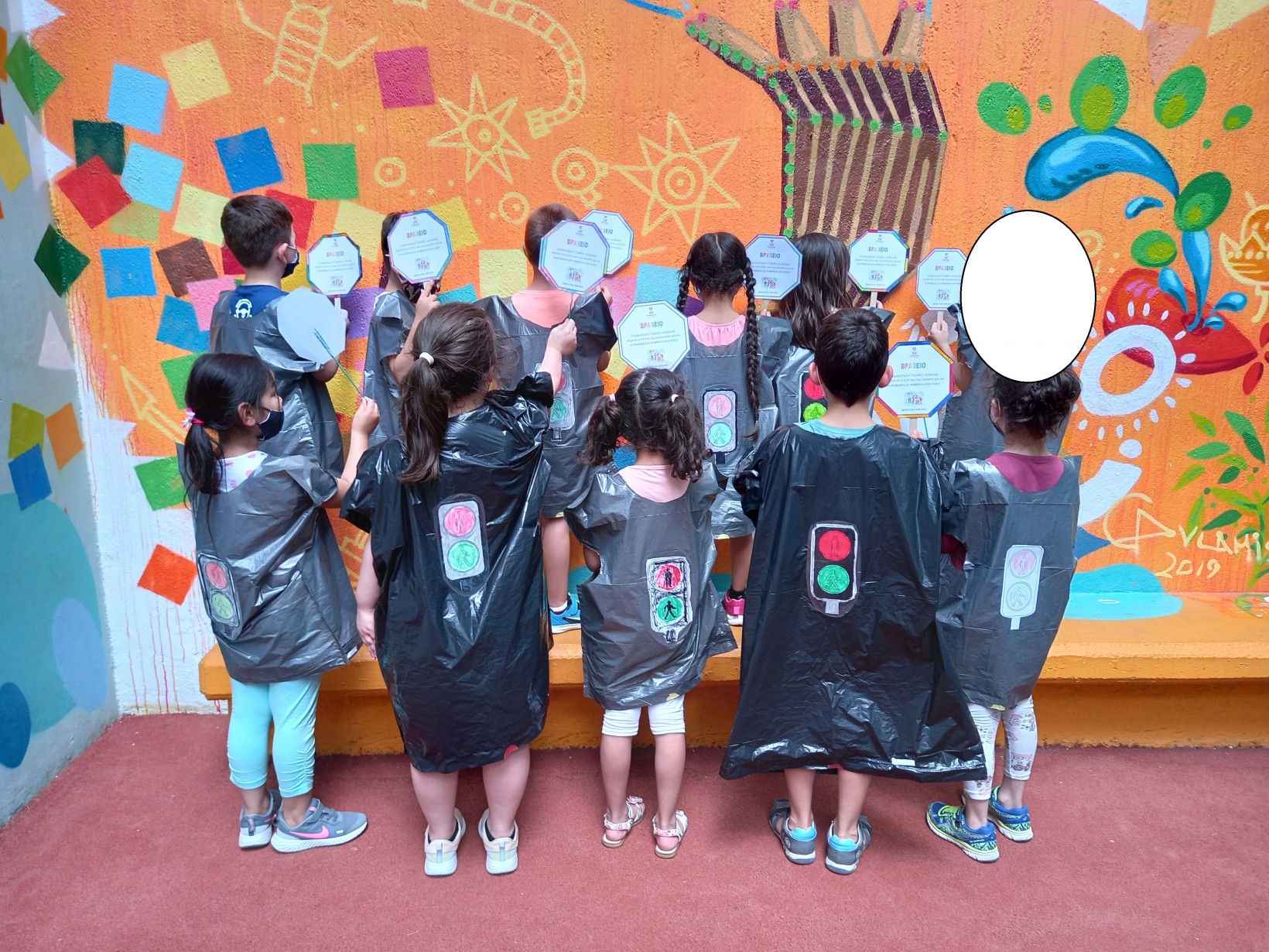 Τέλος, για να κλείσει ευχάριστα το πρόγραμμα της κυκλοφοριακής αγωγής, φτιάξαμε βραβεία και αποφασίσαμε να τα κρατάμε ντυμένοι…φανάρια! Κόψαμε κύκλους και τους κολλήσαμε σε πλαστική σακούλα σκουπιδιών και φύγαμε έτσι για το σπίτι μας!