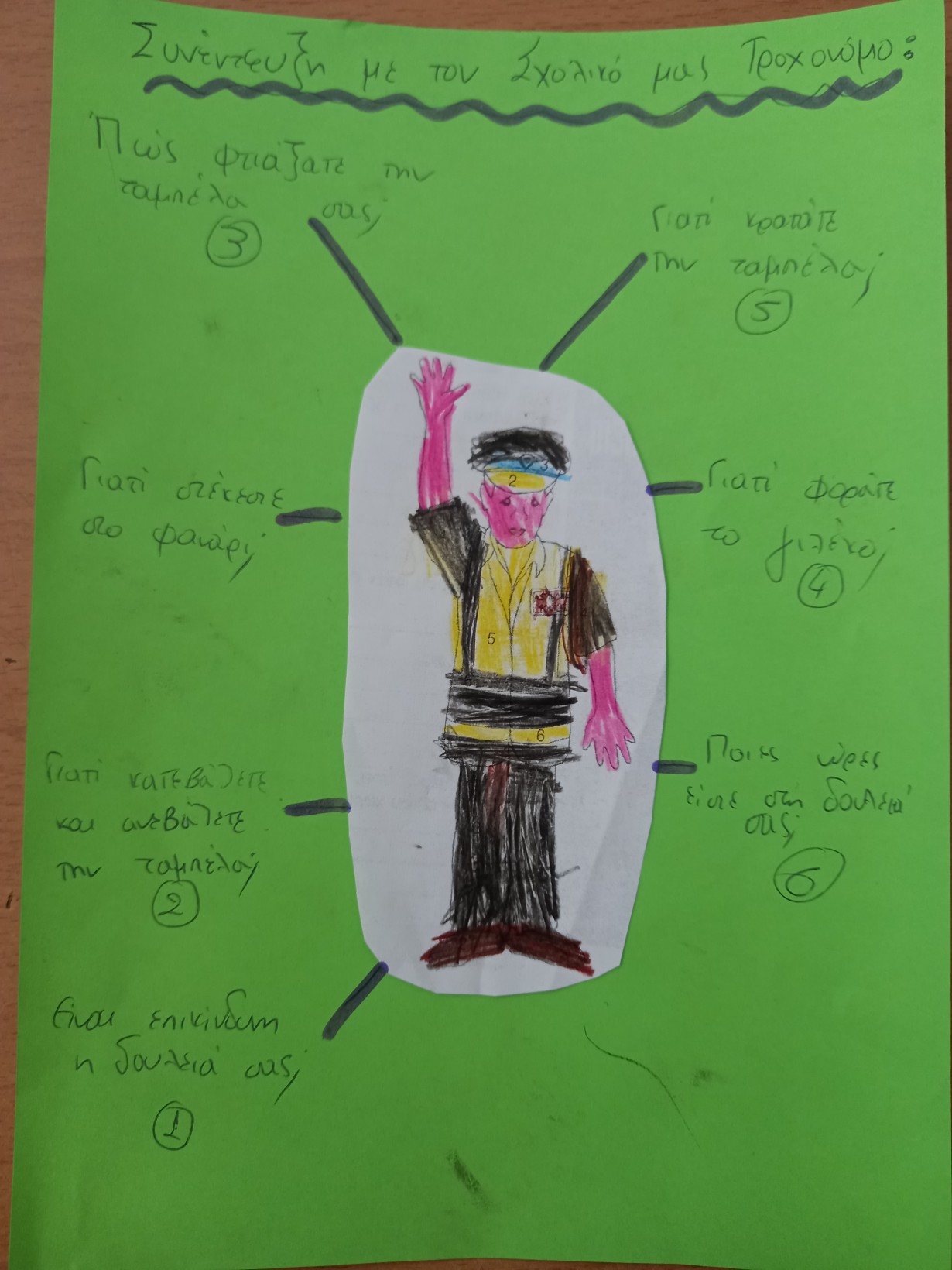 Ποιος μπορεί να ξέρει καλά τα σήματα κυκλοφορίας; Μα φυσικά ο σχολικός μας τροχονόμος που κάθε πρωί και κάθε μεσημέρι τον συναντάμε στον δρόμο έξω από το σχολείο μας! Τον καλέσαμε στην τάξη μας για να του πάρουμε συνέντευξη! “Γιατί ανεβάζετε και κατεβάζετε την ταμπέλα;”, “πώς την φτιάξατε;”, “γιατί στέκεστε στο φανάρι;” ήταν μερικές από τις ερωτήσεις που καταγράψαμε για να του κάναμε από κοντά
