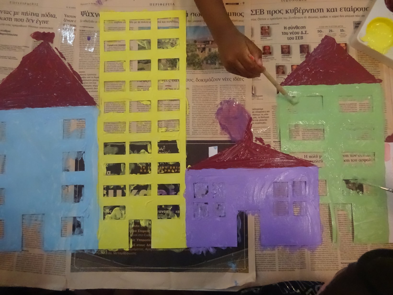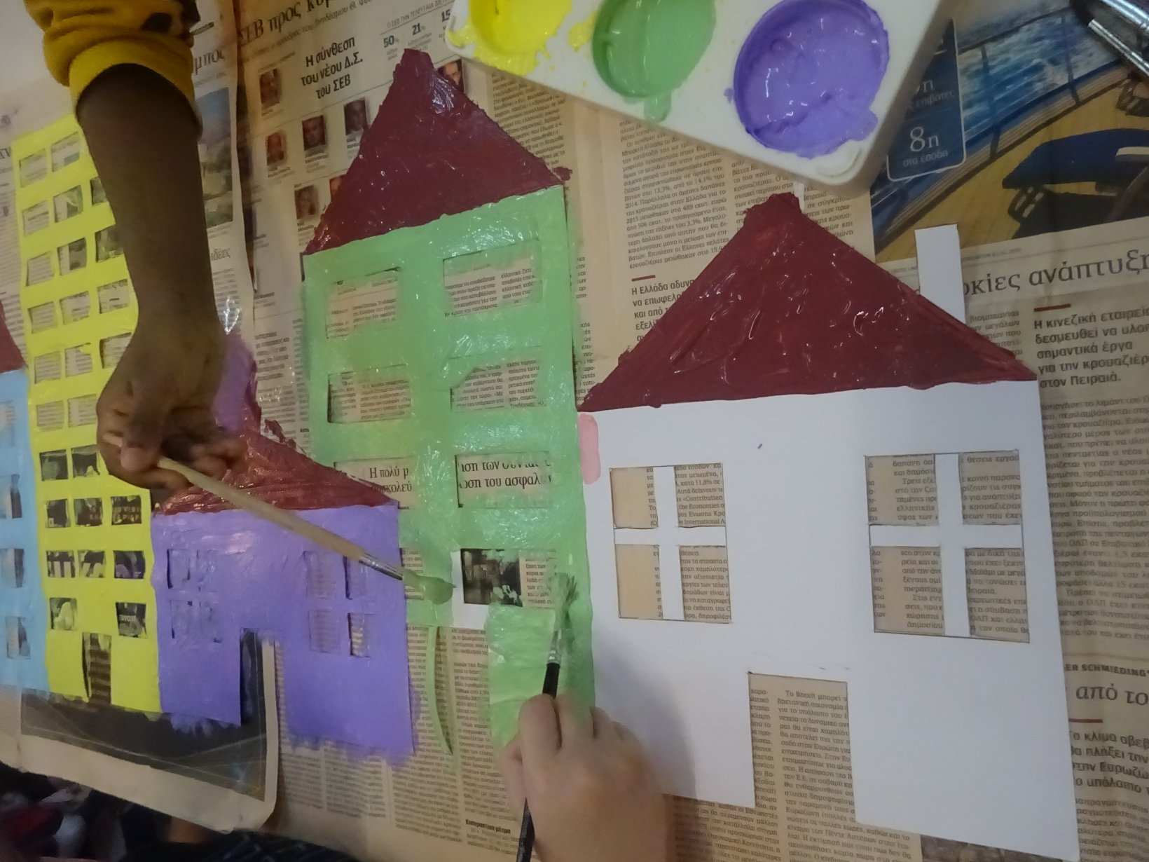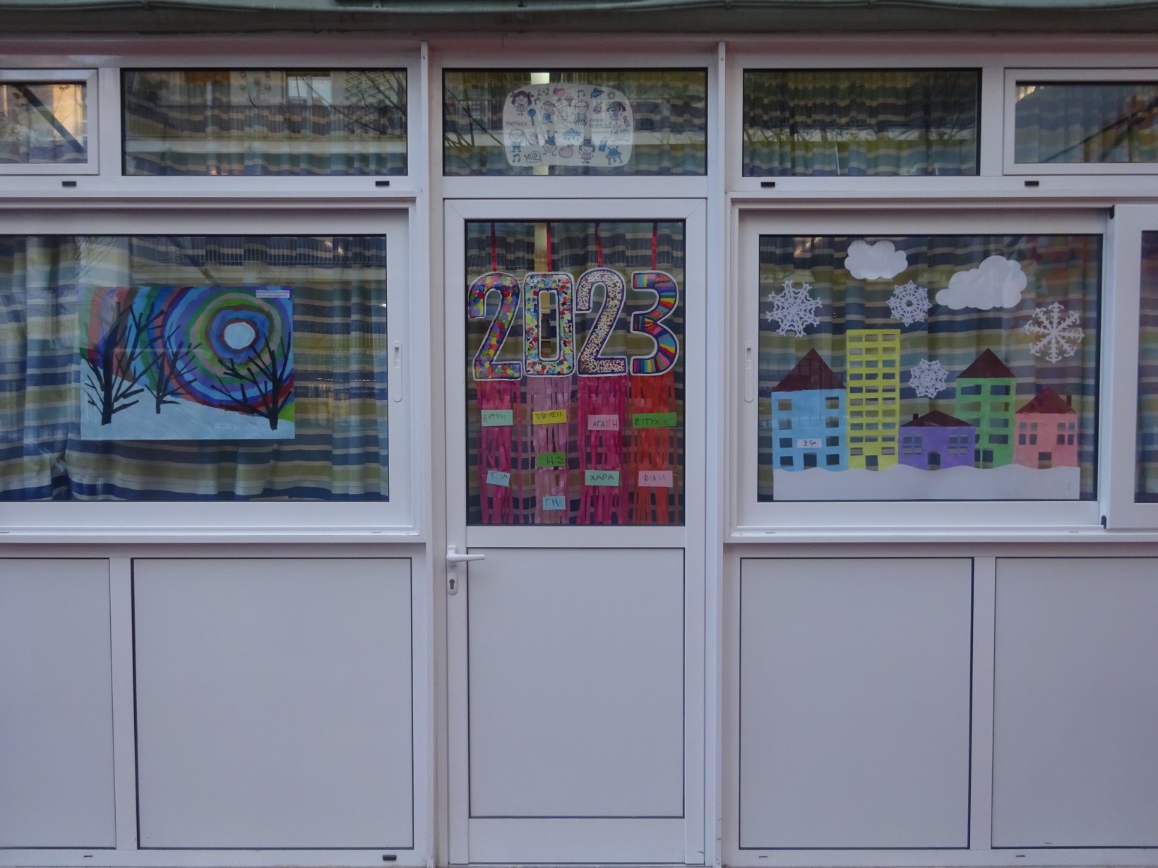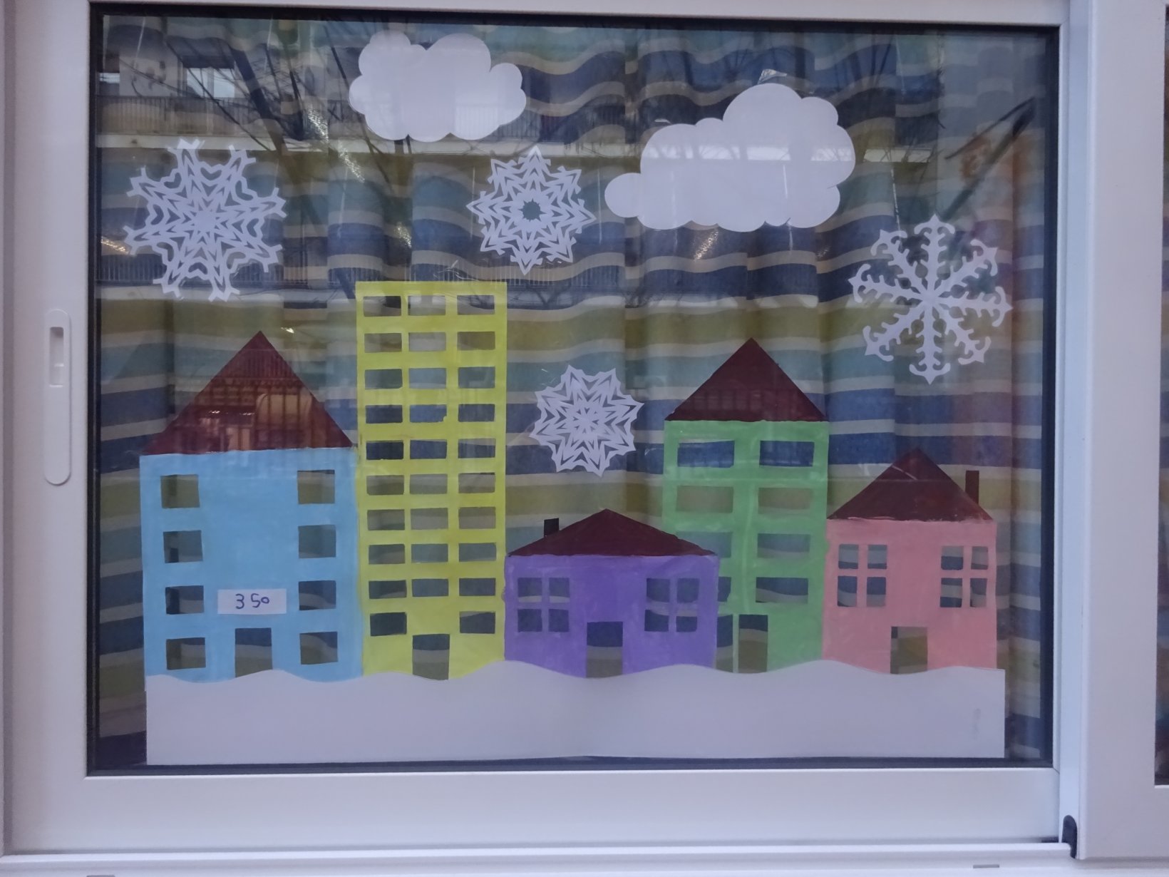 Τέλος, αποφασίσαμε να στολίσουμε τα παράθυρο της τάξης μας με μια χειμωνιάτικη γειτονιά. Χρωματίσαμε κτίρια από χαρτί με όμορφα χρώματα, πολυκατοικίες, σπίτια, ακόμα και το σχολείο μας. Βάλαμε σύννεφα και χιονονιφάδες και κολλήσαμε τη σύνθεση στο παράθυρό μας!