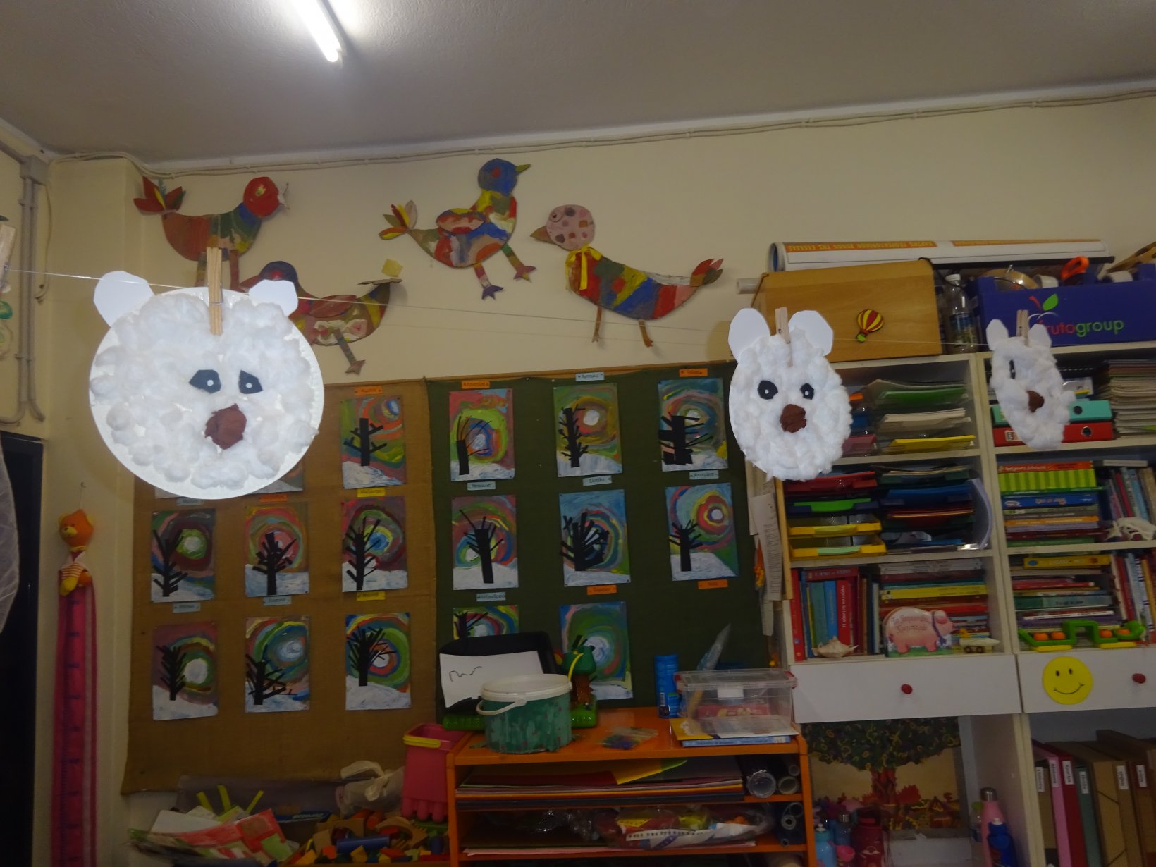 Τα κολλήσαμε στις αρκουδίτσες μας μαζί με μια μυτούλα από καφέ γκοφρέ χαρτί. Έτοιμες οι αρκουδίτσες μας… Τις κρεμάσαμε στην τάξη μας!