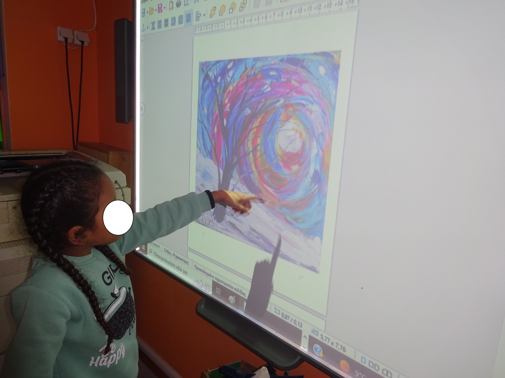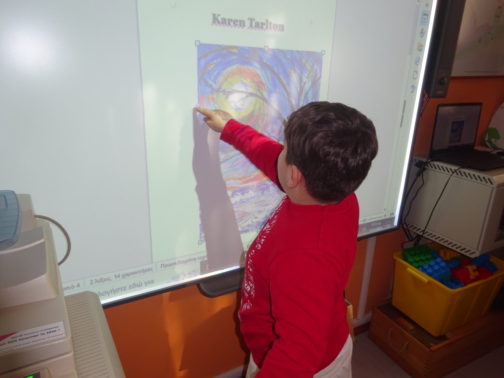 Στη συνέχεια είδαμε στο διαδίκτυο πίνακες ζωγραφικής με θέμα τον χειμώνα. Ξεχωρίσαμε τη ζωγράφο Κaren Tarlton και τα χαρακτηριστικά της χειμωνιάτικα δέντρα. Εντοπίσαμε τα χρώματα που χρησιμοποιεί η ζωγράφος, την κυκλικότητα των χρωμάτων, τον ήλιο στο βάθος…Μάλιστα παρατηρήσαμε πως το δέντρο βρίσκεται σε μια κατηφόρα γιατί το χιόνι σχηματίζει κλίση.