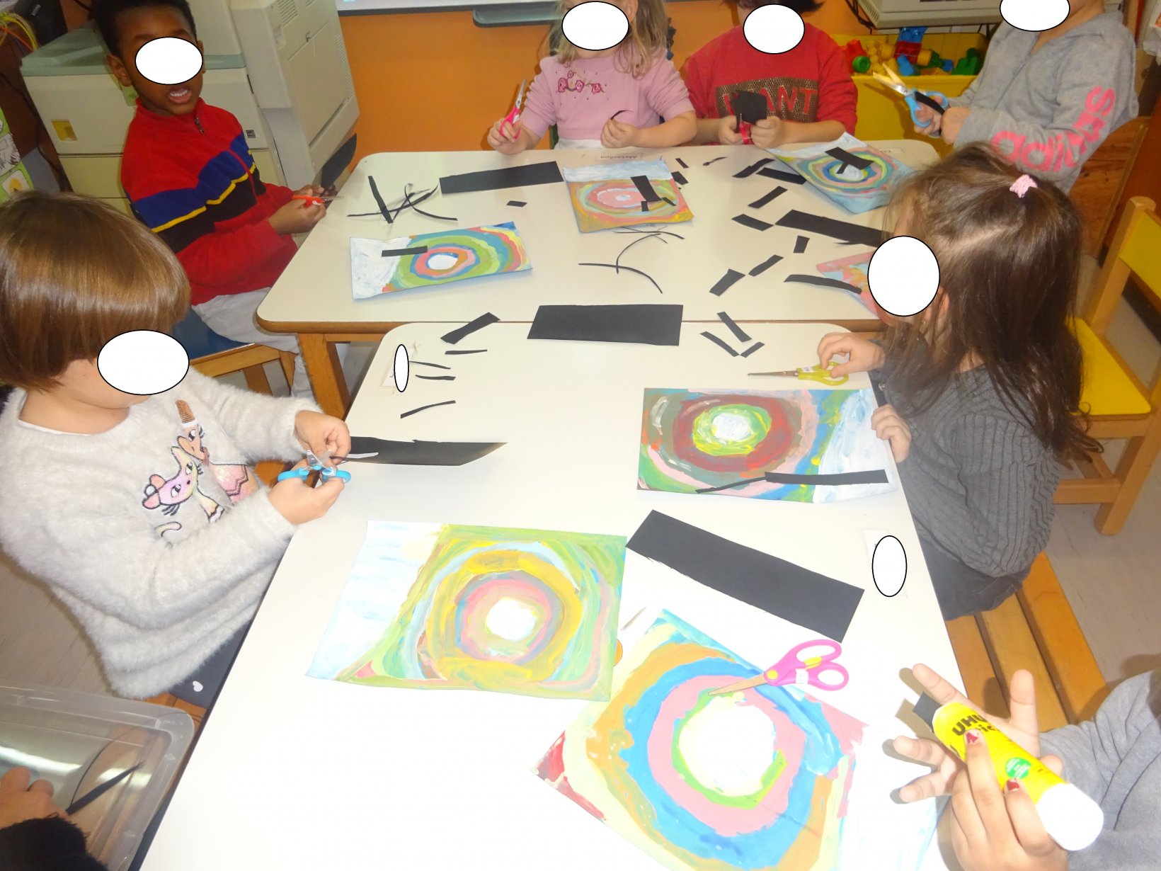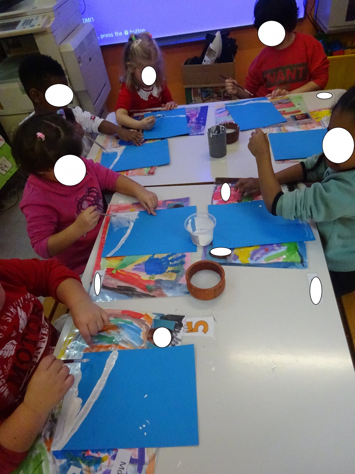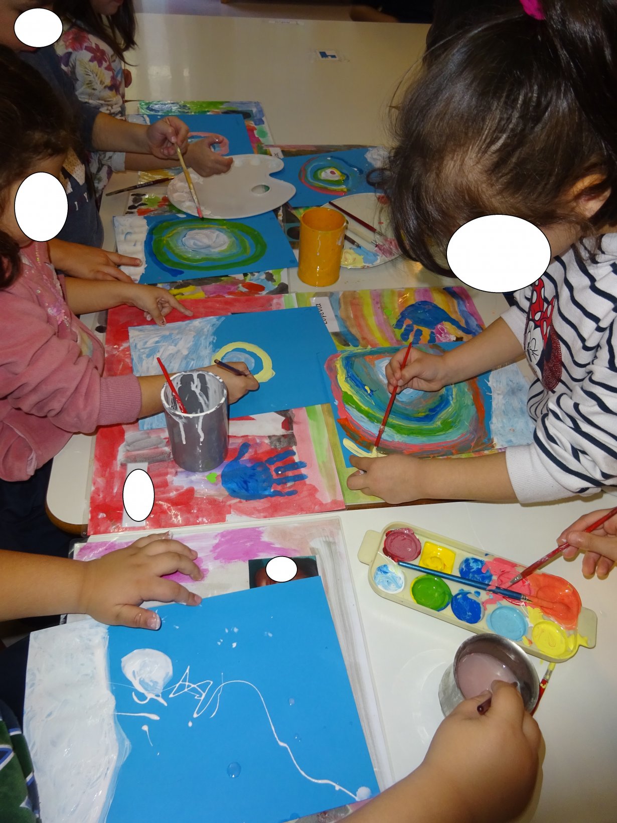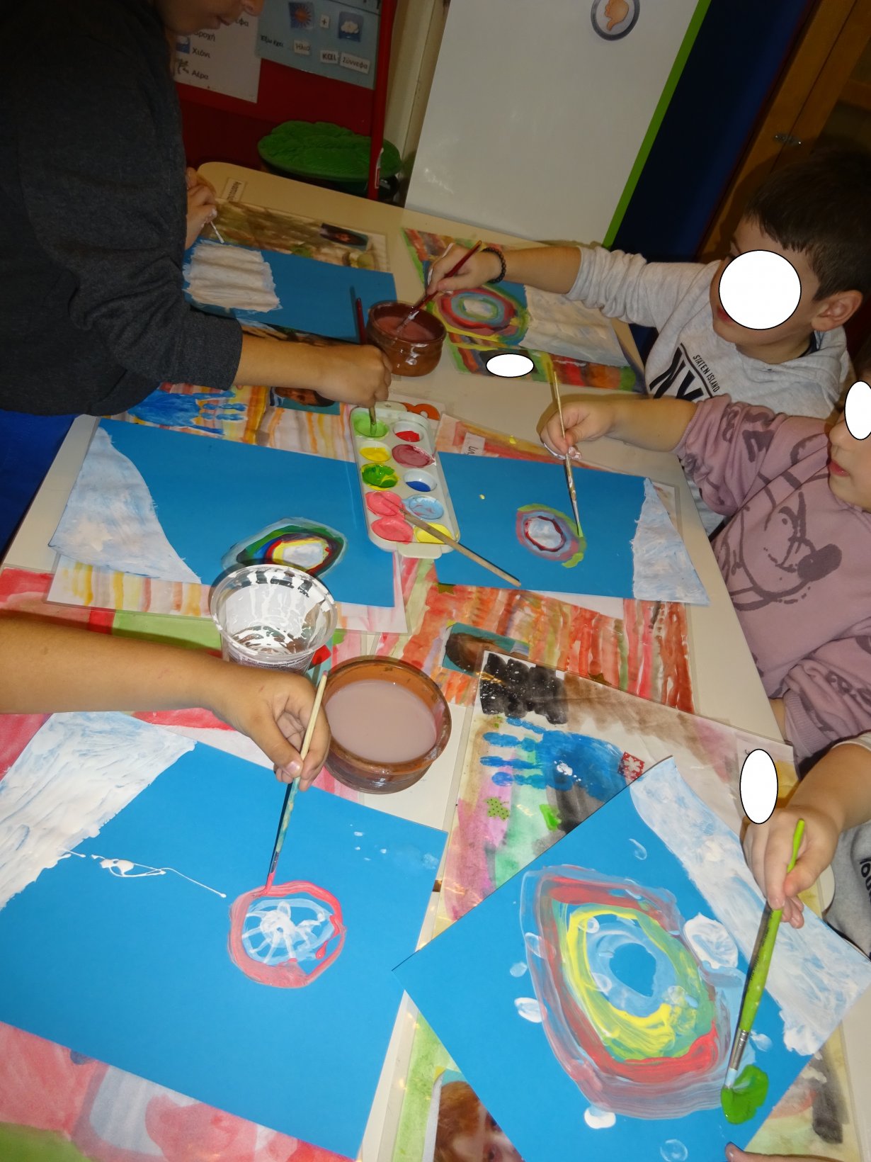 Μας άρεσε τόσο πολύ ο πίνακας και σκεφτήκαμε να τον κάνουμε ατομική εργασία! Με τα πινέλα μας ζωγραφίσαμε αρχικά το χιόνι και μετά το φόντο. Διαλέξαμε πολλά χρώματα και κάναμε κύκλους γύρω από τον ήλιο, μέχρι να γεμίσει όλο μας το χαρτί! Πανέμορφη δουλειά!