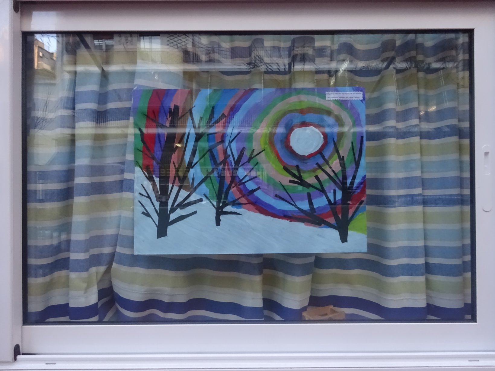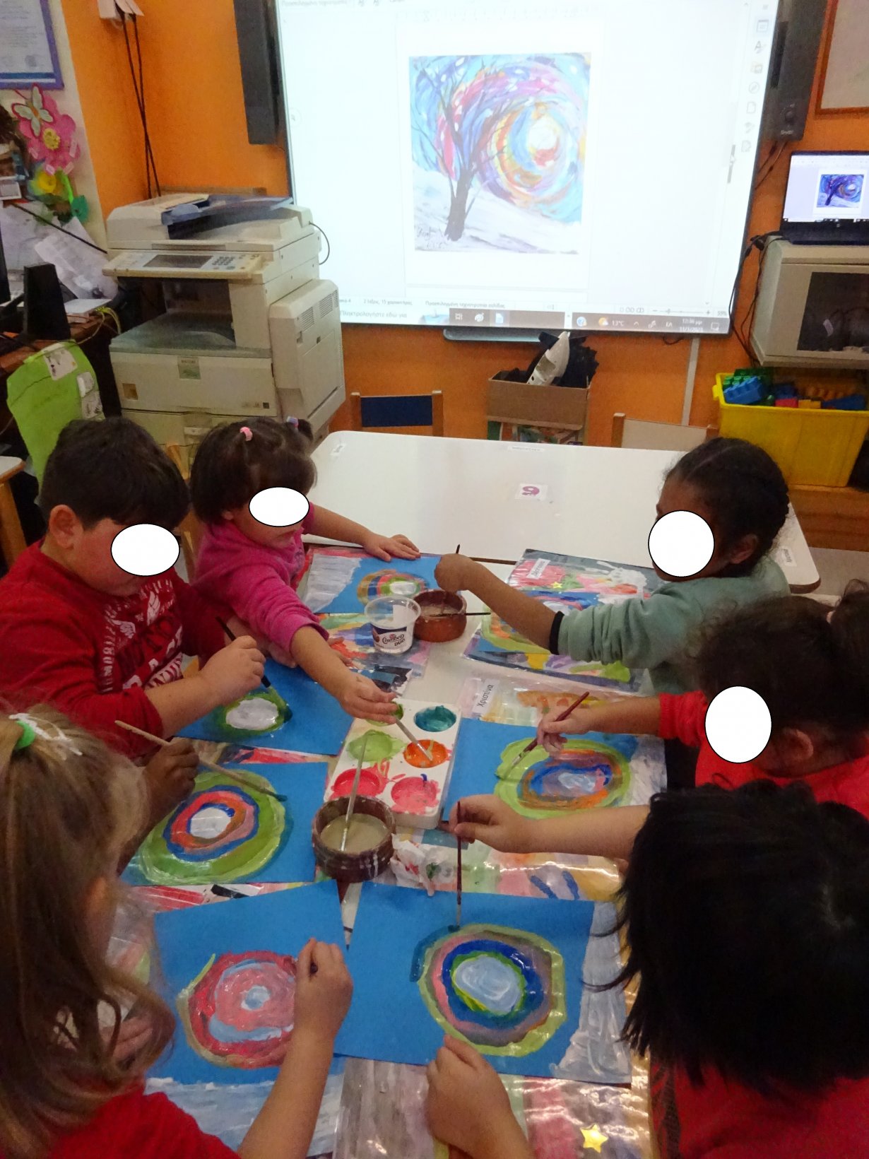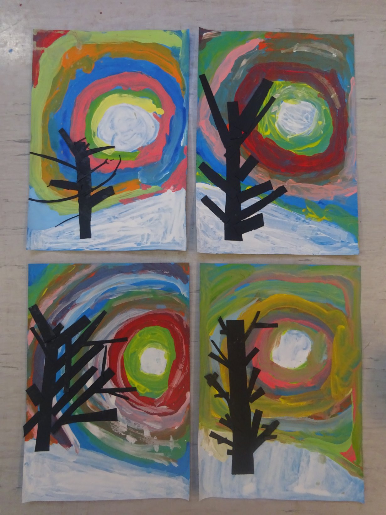 Μάλιστα διασκεδάσαμε τόσο πολύ με την εργασία και αποφασίσαμε να φτιάξουμε και μια ομαδική δουλειά με πολλά δέντρα για το παράθυρο της τάξης μας, εμπνευσμένοι από τον πίνακα της Κaren Tarlton. Ακολουθήσαμε την ίδια διαδικασία. Πρώτα ζωγραφίσαμε το χιόνι και τον ήλιο και μετά πολλούς χρωματιστούς κύκλους.