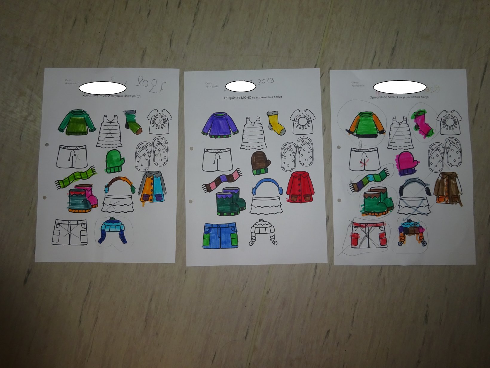 Στο τέλος συμπληρώσαμε δύο φύλλα εργασίας, στο πρώτο χρωματίσαμε μόνο τα χειμωνιάτικα ρούχα και στο δεύτερο αντιστοιχήσαμε κάθε ρούχο με την αντίστοιχη λέξη.