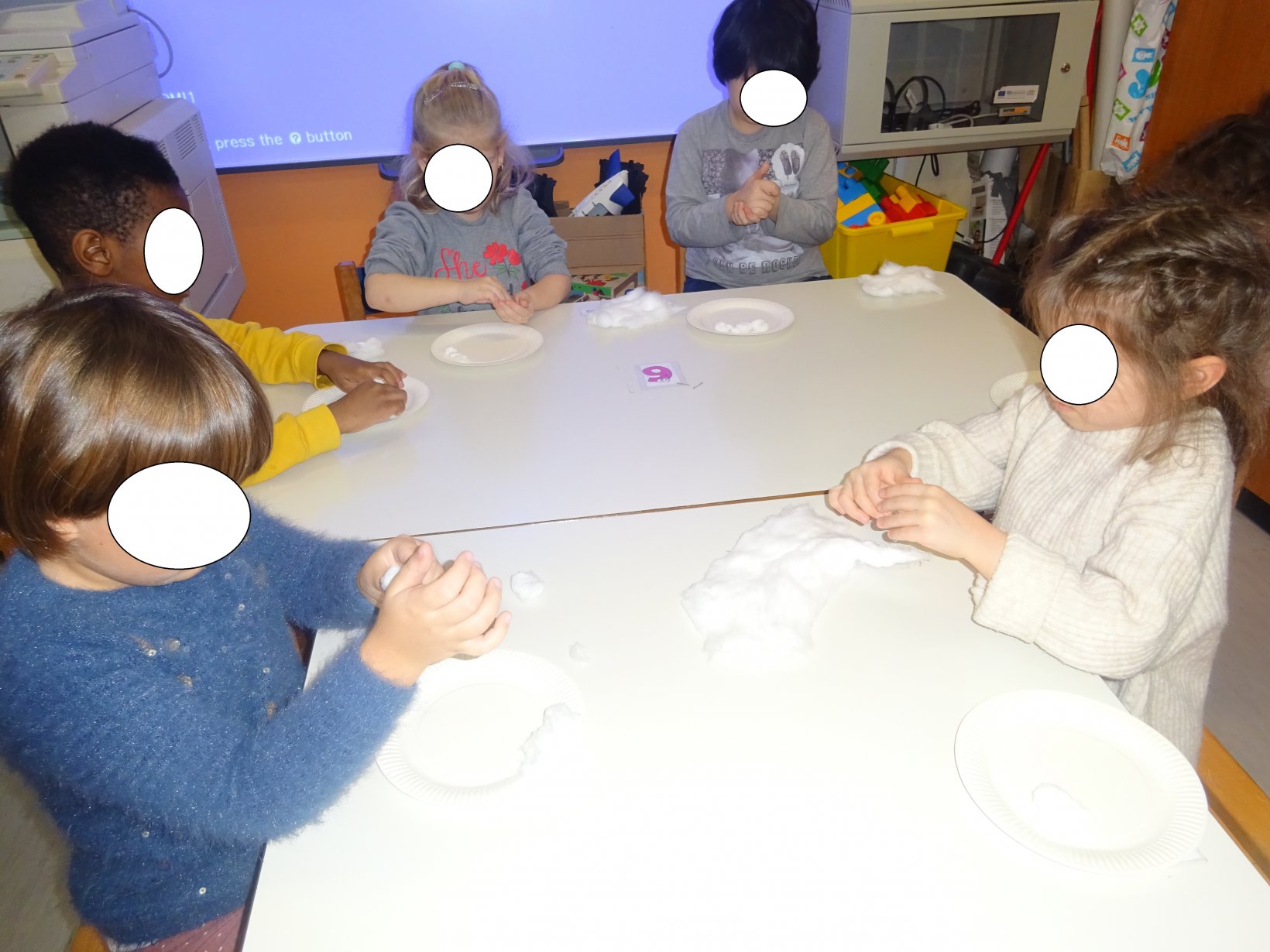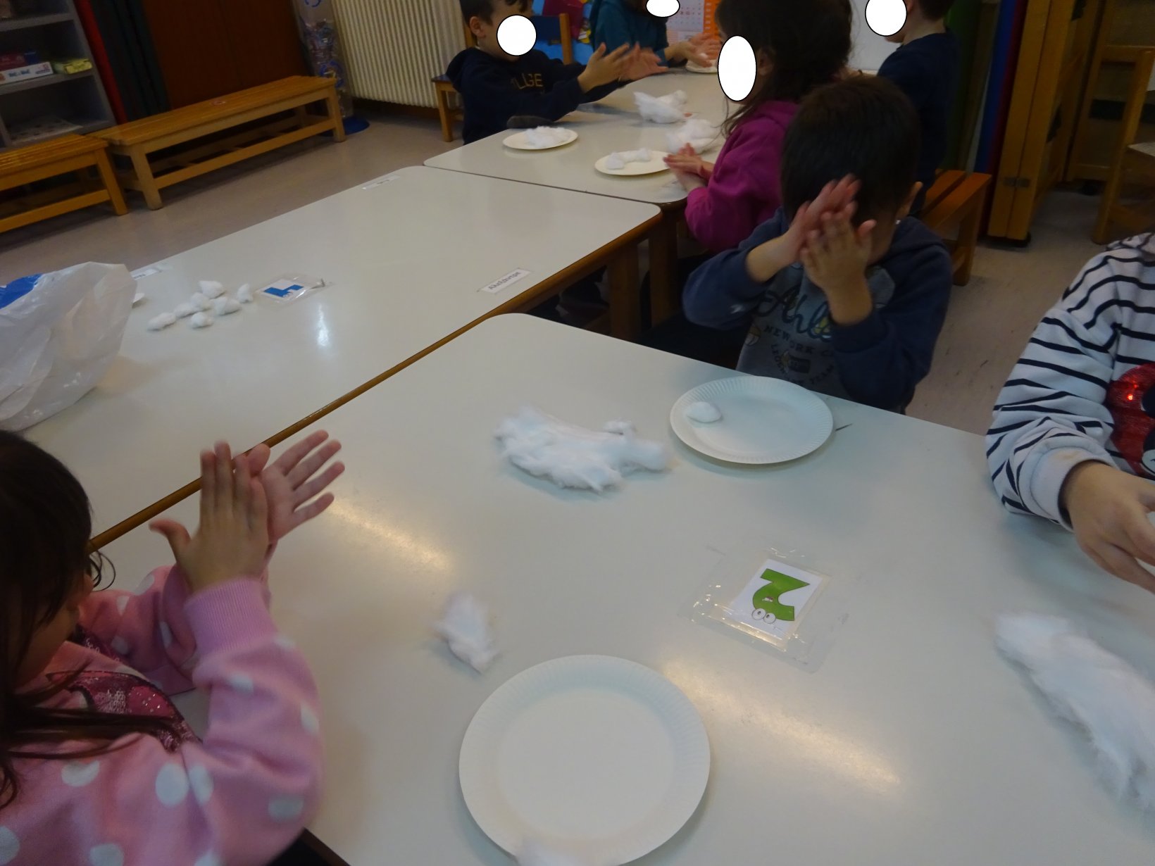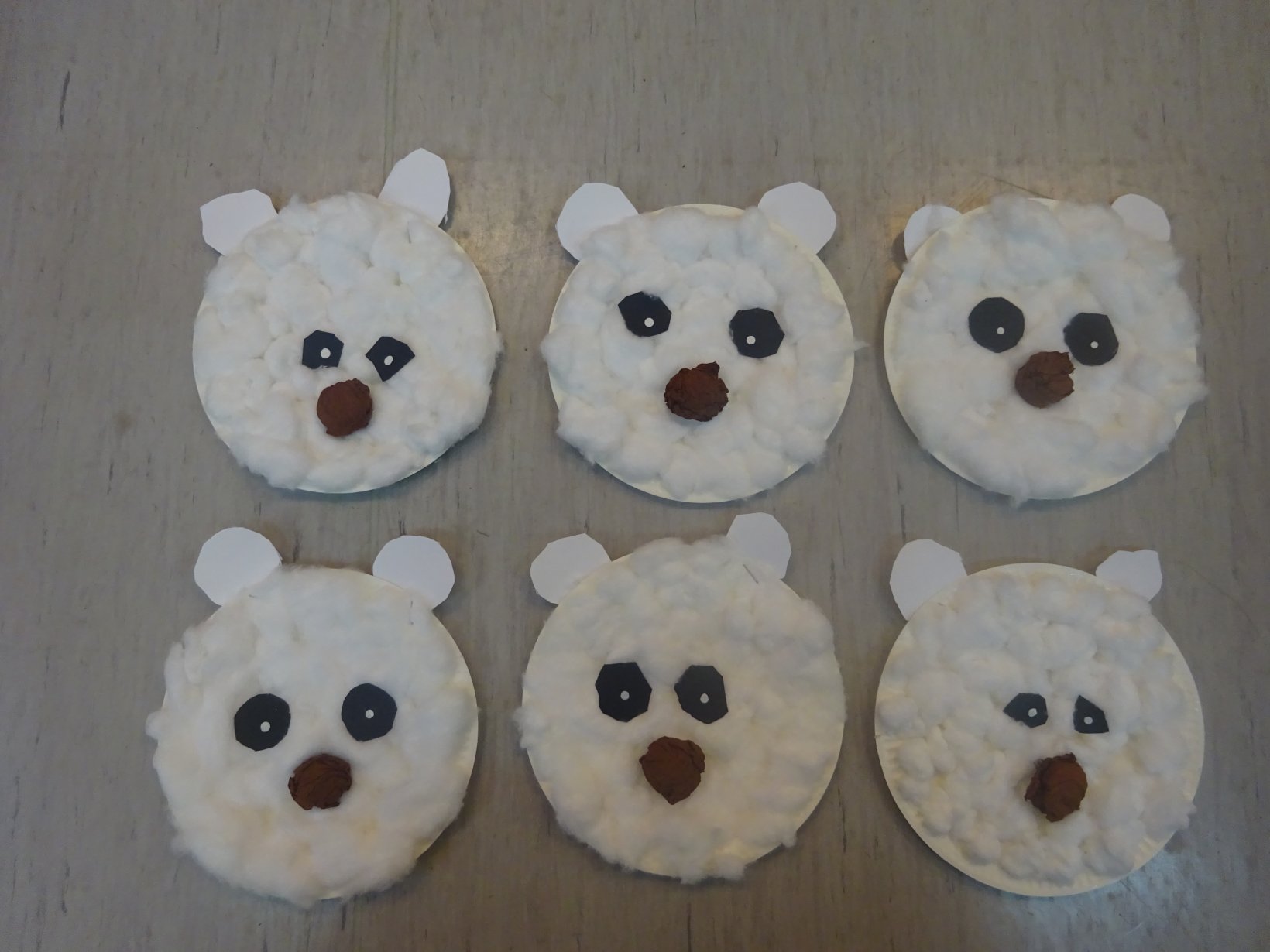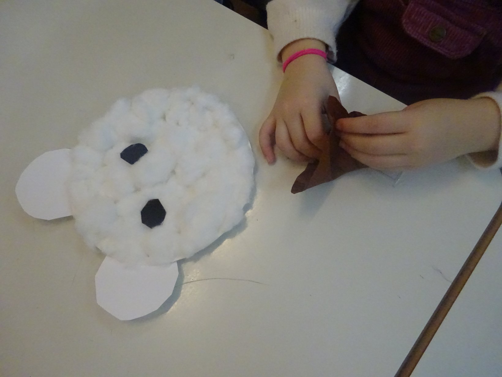 Έτσι, αποφασίσαμε να φτιάξουμε μια ατομική κατασκευή: αρκουδίτσες με χάρτινο πιάτο! Κάναμε μπαλίτσες από βαμβάκι και τις κολλήσαμε στο πιάτο με υγρή κόλλα…