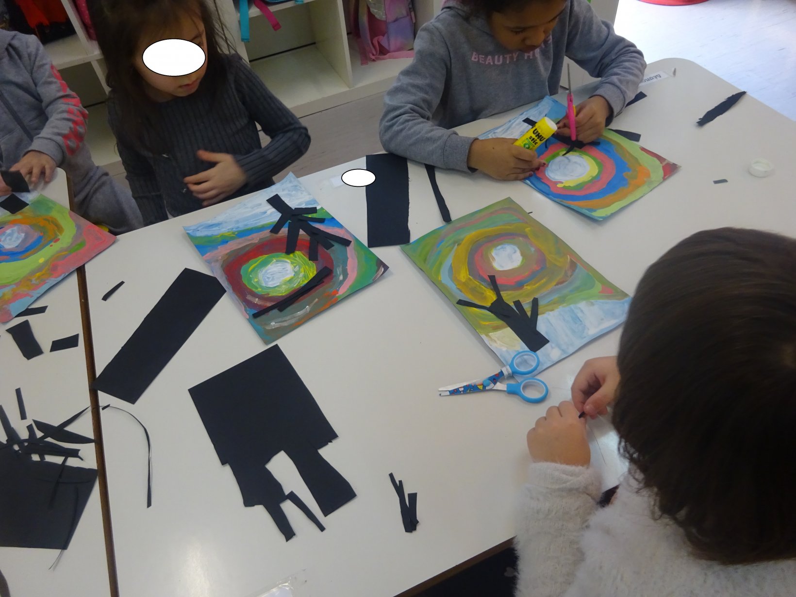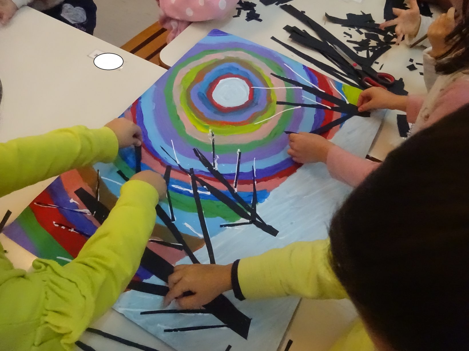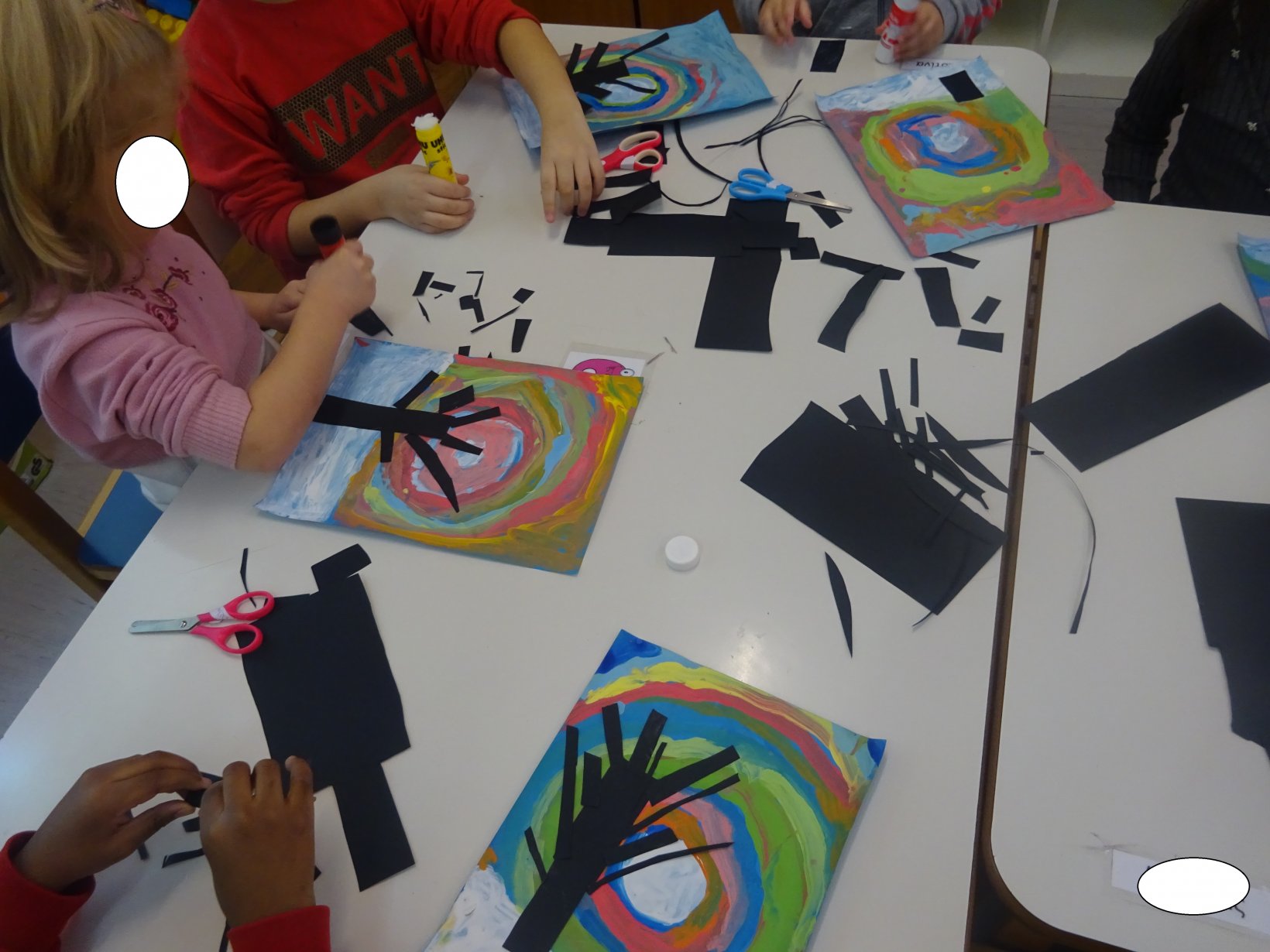 Στο τέλος κόψαμε μαύρες λωρίδες και τις κολλήσαμε ώστε να σχηματιστούν δέντρα με κλαδιά.