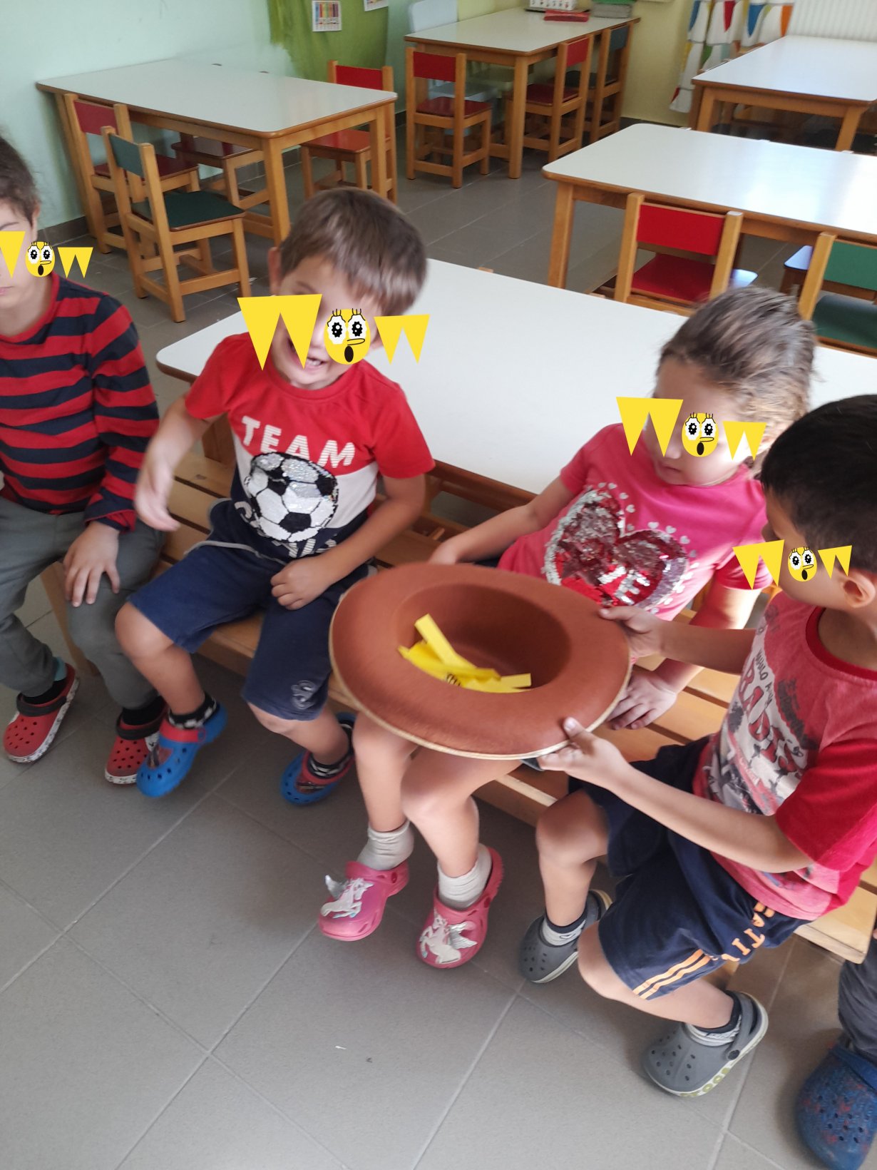 Ομαδικό παιχνίδι με τη συνοδεία μουσικής. Στο καπέλο είναι τοποθετημένες οι ονομαστικές καρτέλες των παιδιών. Τη στιγμή που διακόπτεται το τραγούδι το παιδί που κρατά στο χέρι του το καπέλο επιλέγει μια κάρτα να τραβήξει. Τη δείχνει στην ομάδα και αφού γίνει η αναγνώριση ξεκινά ο συλλαβισμός της. Ακολούθως, ομαδοποιούνε τις λέξεις με τον ίδιο αριθμών συλλαβών.