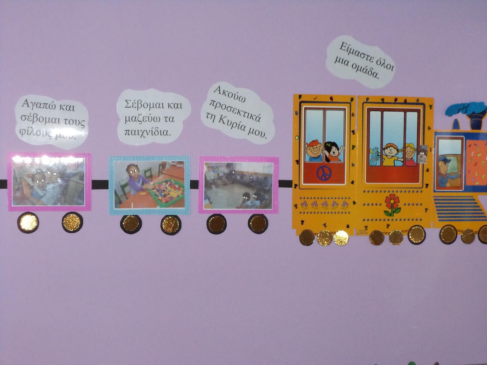 Είναι ένα τρενάκι που φτιάξαμε στην αρχή της χρονιάς με τα παιδιά(ιδέα της φίλης μας Δέσποινας)όπου σε συννεφάκια καπνού γράψαμε τους κανόνες και τους φωτογραφίσαμε κιόλας,ώστε να γίνεται καθημερινά η αντιστοίχιση από τα νήπια.