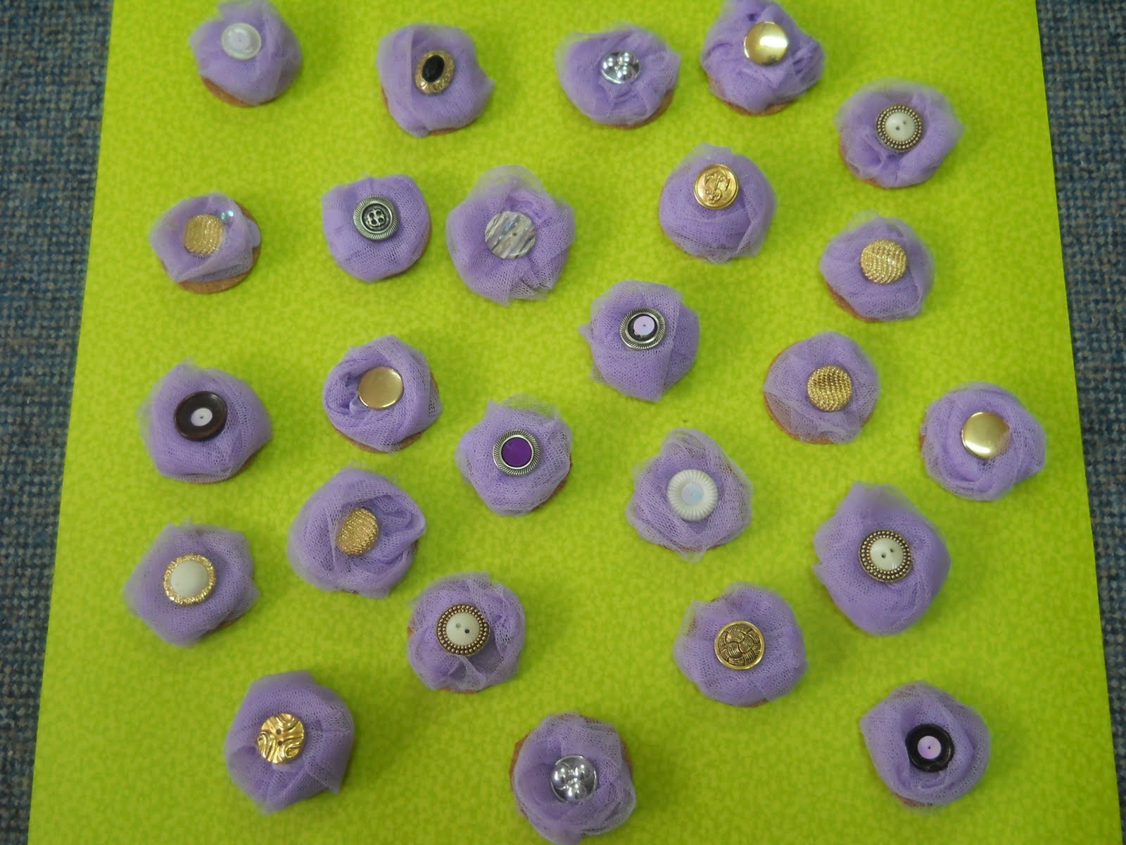 Έπειτα πήραμε τούλι μωβ από την αποθήκη μας(πόσα χρόνια φυλαγμένο ήταν ..)και με ζεστή σιλικόνη το κολλήσαμε ,πάντα με τη βοήθεια μας και ένα-ένα παιδάκι,αφού πρώτα με τα δαχτυλάκια μας δώσαμε στο τούλι σχήμα λουλουδιού..μπουτονιέρας.