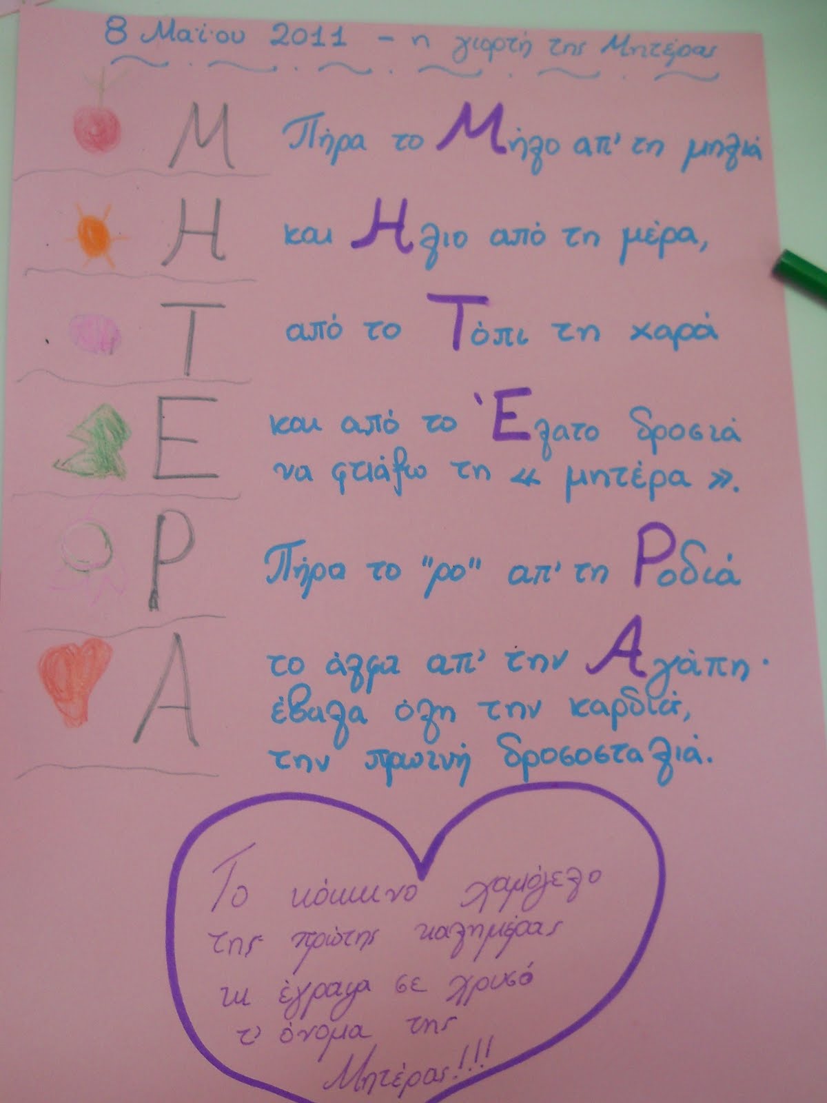 έπειτα τα παιδιά μας είπαν πως φωνάζουν τη μαμά τους και κάναμε τη λέξη μητέρα ακροστοιχίδα και ζωγραφίσαμε!!!