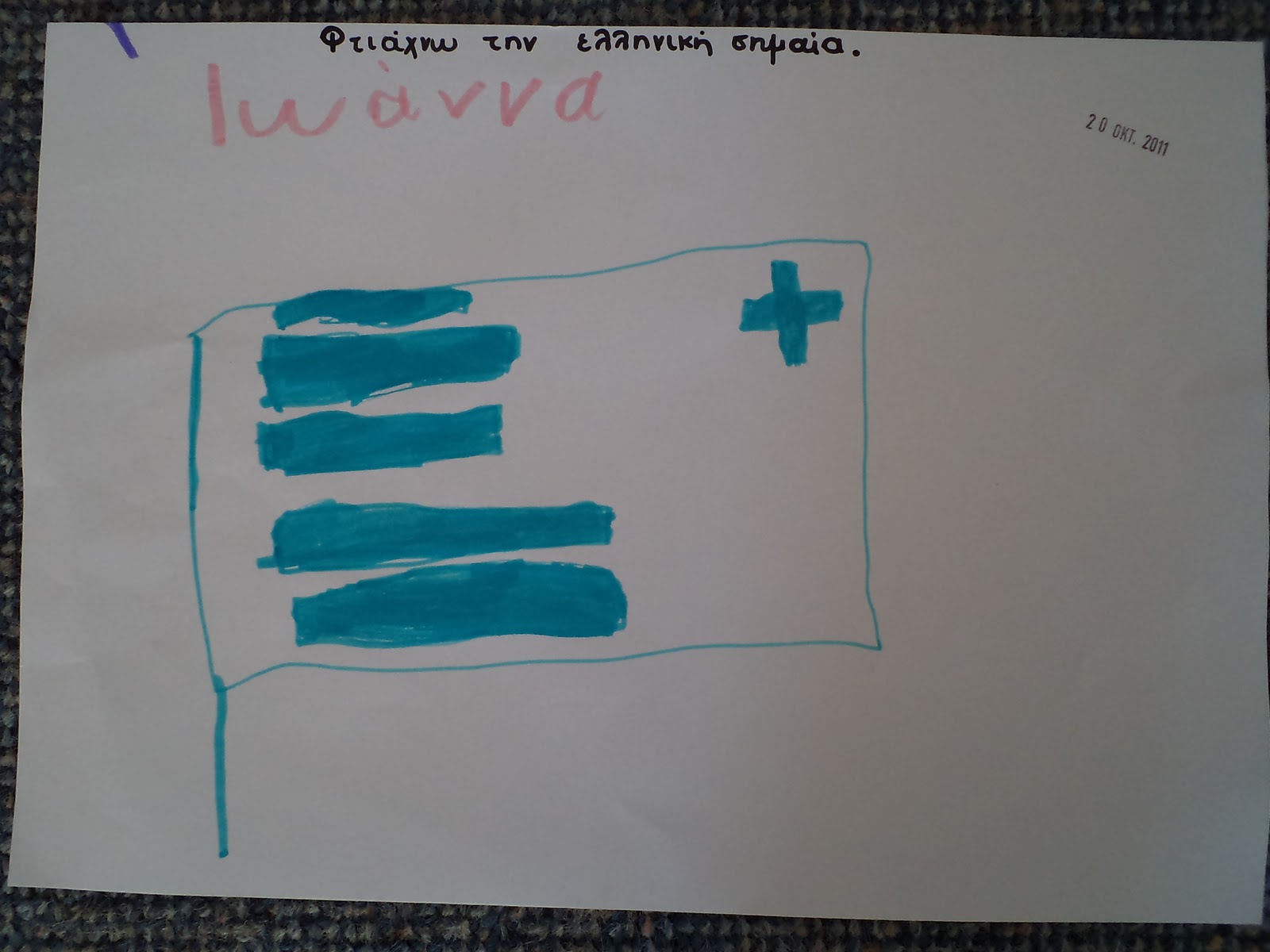 Ήρθε και η ώρα της ζωγραφιάς μας για την 28ηΟκτωβρίου.Δεν ήθελα να περιορίσω τη φαντασία των παιδιών μέσα σε έτοιμα περιγράμματα για αυτό πρότεινα να φτιάξουμε όλοι την ελληνική σημαία.Ο ενθουσιασμός ήταν μεγάλος.Κάποιες αντιδράσεις από προνήπια μόνο ,όπου δίσταζαν.Ύστερα από την παρακίνησή μου ,νομίζω πως τα κατάφεραν καλά,ε;