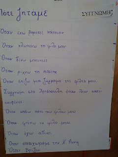 Αφού κόψαμε καρτελάκια με τη λέξη συγγνώμη ,τα παιδιά αντάλλαζαν τη συγγνώμη τους εκεί που έπρεπε να τη δώσουν.(συγγνώμη Ν.που σε κλώτσησα….συγγνώμη κ.Άννη που σε πάτησα…η αλήθεια είναι πως με έχουν χιλιοπατήσει….χιχι)