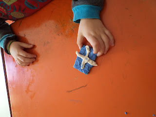 Μια μαμά μου έφερε αυτά τα μεγάλα παζλ τα αφρώδη και εγώ αμέσως θέλησα να τα χρησιμοποιήσω στη κατασκευή.Έκοψα σε σχήμα τετράγωνο και πάνω σε αυτό τα παιδιά άπλωσαν το ζυμάρι και έφτιαξαν μια σημαιούλα!!!