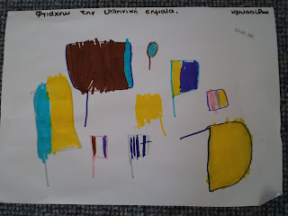 Ήρθε και η ώρα της ζωγραφιάς μας για την 28ηΟκτωβρίου.Δεν ήθελα να περιορίσω τη φαντασία των παιδιών μέσα σε έτοιμα περιγράμματα για αυτό πρότεινα να φτιάξουμε όλοι την ελληνική σημαία.Ο ενθουσιασμός ήταν μεγάλος.Κάποιες αντιδράσεις από προνήπια μόνο ,όπου δίσταζαν.Ύστερα από την παρακίνησή μου ,νομίζω πως τα κατάφεραν καλά,ε;
