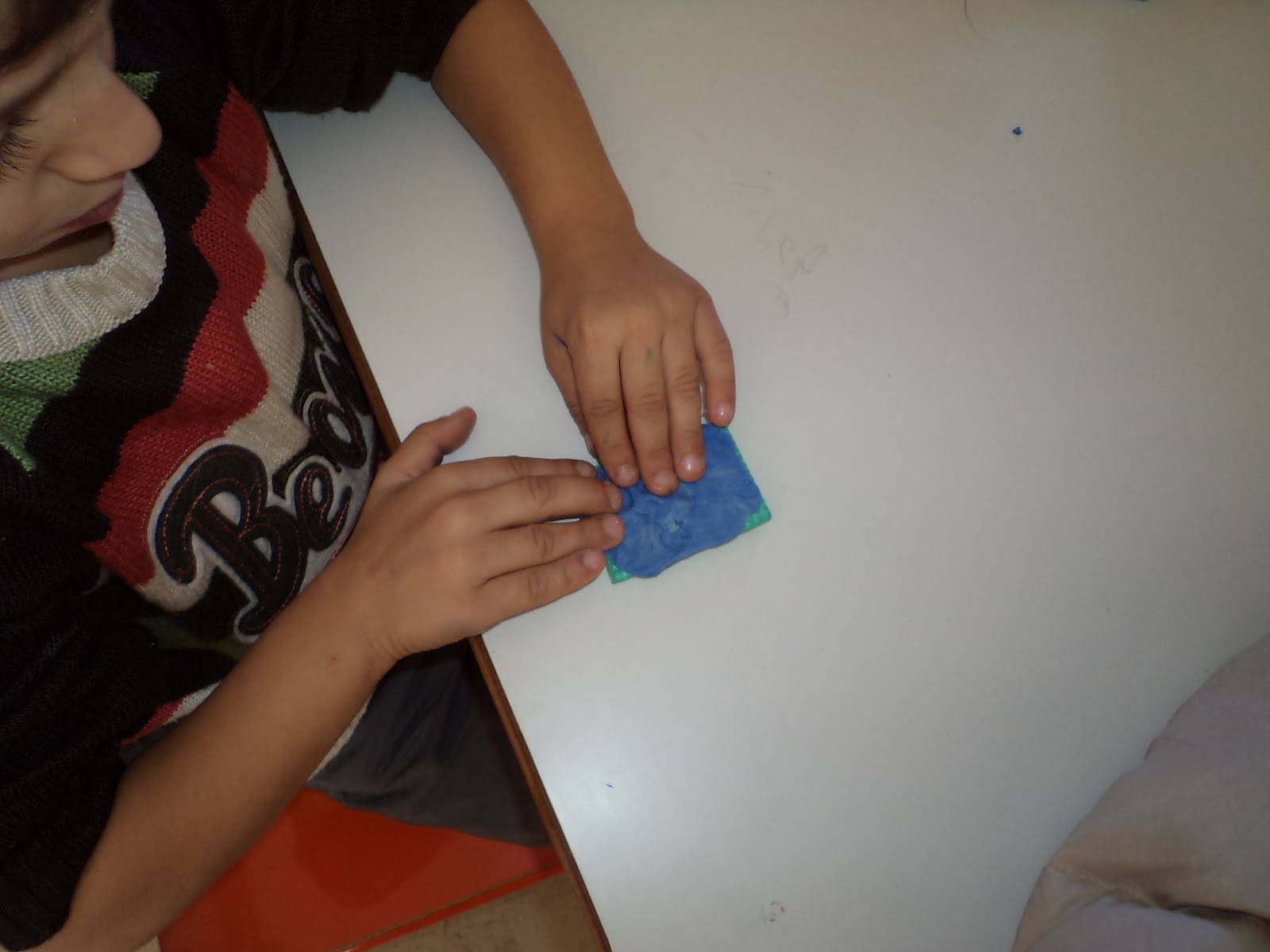 Μια μαμά μου έφερε αυτά τα μεγάλα παζλ τα αφρώδη και εγώ αμέσως θέλησα να τα χρησιμοποιήσω στη κατασκευή.Έκοψα σε σχήμα τετράγωνο και πάνω σε αυτό τα παιδιά άπλωσαν το ζυμάρι και έφτιαξαν μια σημαιούλα!!!