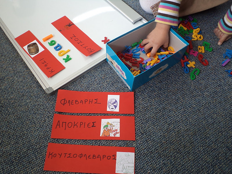 Φτιάξαμε καρτέλες για το λεξιλόγιο του μήνα και παίξαμε με τα γράμματα  και το μαγνητικό πίνακα από τη γωνιά της γραφής.