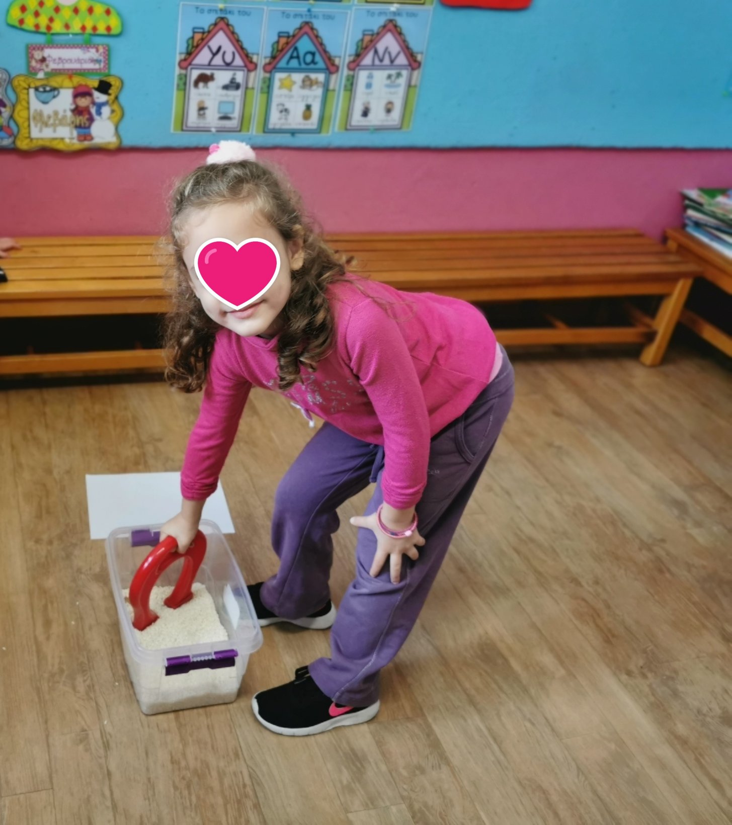 3. Ζητάμε από τους μαθητές και τις μαθήτριες να πάρουν με τη σειρά στα χέρια τους ένα μαγνήτη και να τον πλησιάσουν στο περιεχόμενο του δοχείου. Στη συνέχεια τους ζητάμε να αφαιρέσουν από το δοχείο, ένα αντικείμενο που εμφανίστηκε στην επιφάνεια.