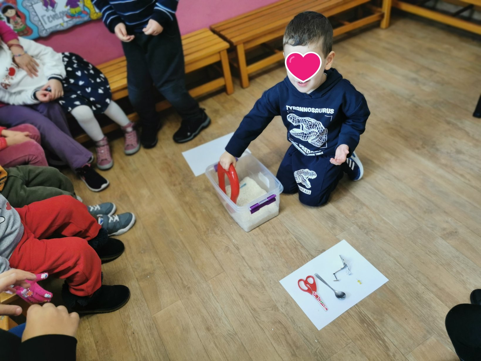 2. Κρύβουμε μέσα στο δοχείο με την άμμο ή το ρύζι διάφορα αντικείμενα. Τα αντικείμενα αυτά χρειάζεται να είναι μεταλλικά αλλά και μη, ώστε να έλκονται και να μην έλκονται από ένα μαγνήτη αντίστοιχα. Μερικά παραδείγματα αντικειμένων είναι: μπάλα από χαρτί, κλειδί, πιρούνι, κουτάλι, μανταλάκι, συνδετήρας, σελοτέιπ, γόμα, μολύβι κ.λπ..