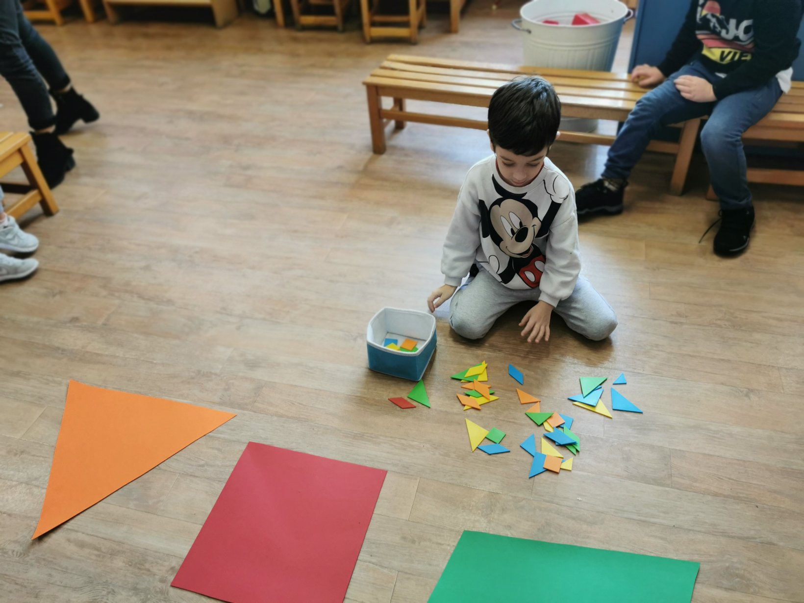 1. Μοιράζουμε σε κάθε μαθητή και μαθήτρια στην τάξη χάρτινα γεωμετρικά σχήματα, κόλλα και ένα λευκό χαρτί. Στα γεωμετρικά σχήματα μπορούμε τώρα να συμπεριλάβουμε και τον κύκλο ή το οβάλ. Επιπλέον τα γεωμετρικά σχήματα δεν χρειάζεται να έχουν το ίδιο μέγεθος.