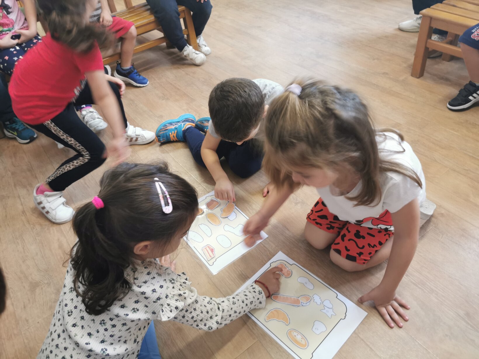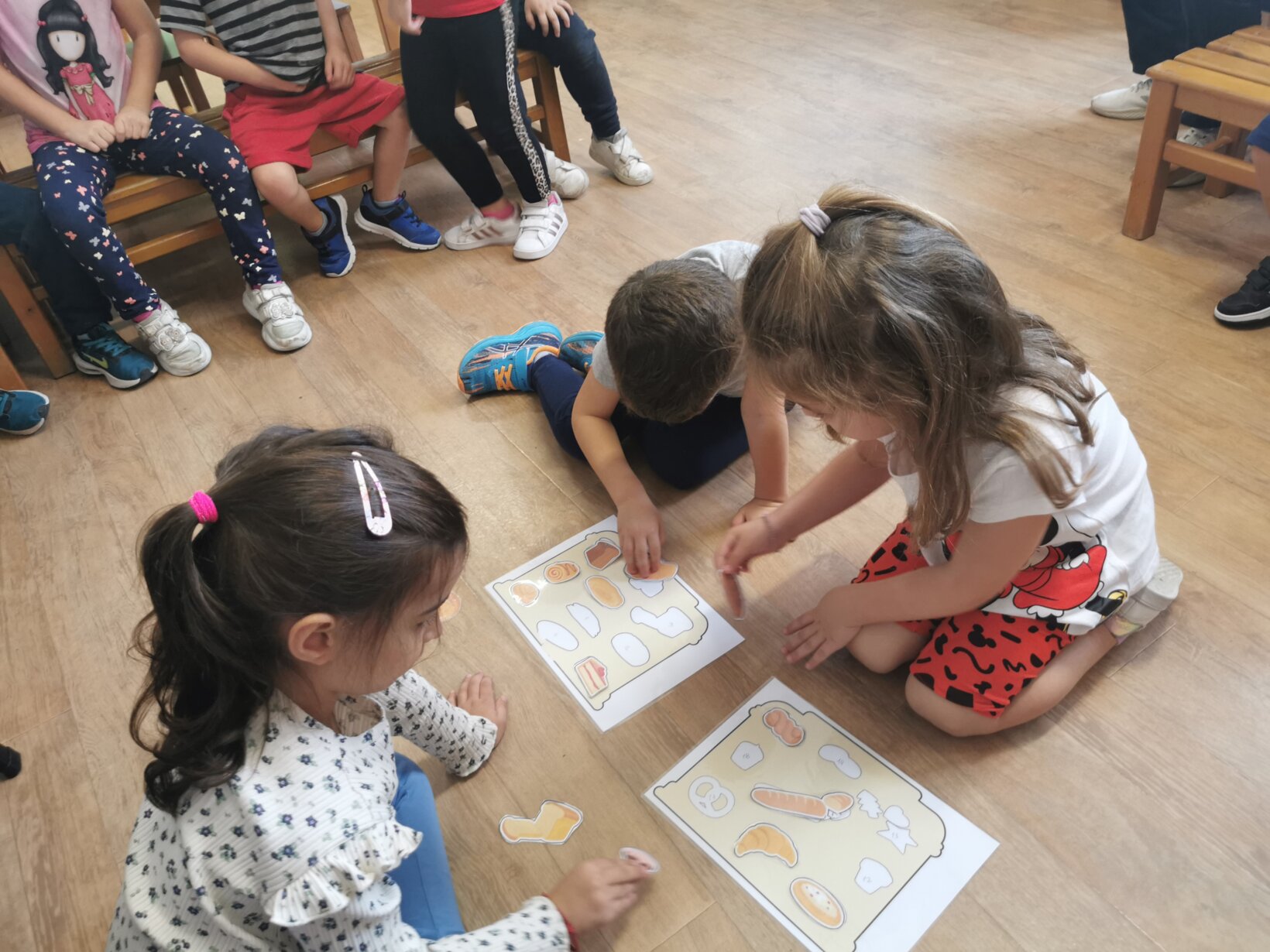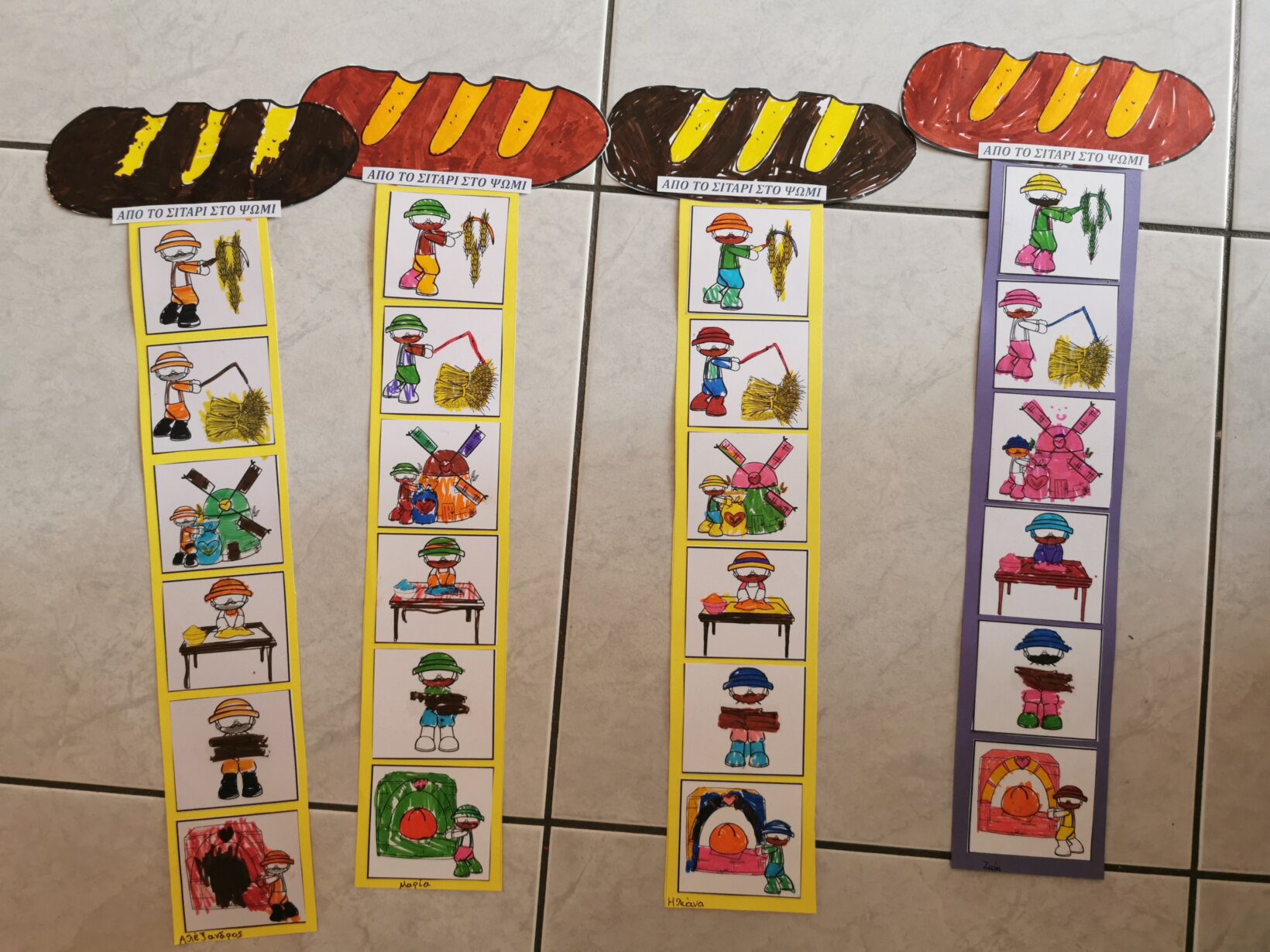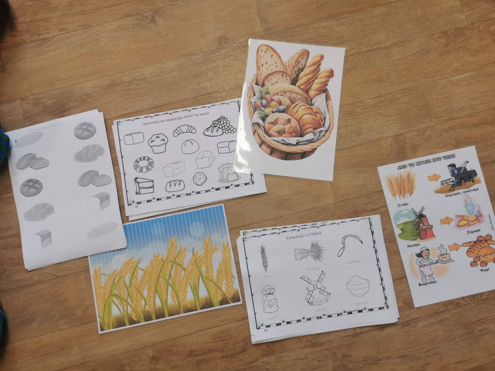 Με αφορμή την εκδρομή που πρόκειται να πραγματοποιήσουμε την Τρίτη 7 Νοεμβρίου 2023 στο Paradise Park, ασχοληθήκαμε με τη διαδικασία παραγωγής ψωμιού. Διαβάσαμε το παραμύθι “το πιο γλυκό ψωμί” και περιγράψαμε αναλυτικά τα στάδια (σιτάρι – θερισμός – αλώνισμα – άλεσμα – ζύμωμα – ψήσιμο). Μιλήσαμε για το αλεύρι ως το κύριο συστατικό για την παρασκευή και άλλων προϊόντων, όπως τσουρέκι, κρουασάν, κουλουράκια, πίτσα κτλ. Πήραμε μια εικόνα για τη μορφή που έχουν τα προϊόντα αυτά μέσα από διάφορα παιχνίδια, όπως π.χ. παζλ, τοποθέτηση προϊόντων στην αντίστοιχη θέση κτλ. Αφού κατανοήσαμε τα παραπάνω, ζωγραφίσαμε, κόψαμε και βάλαμε στη σωστή σειρά τις εικόνες με τα στάδια παραγωγής του ψωμιού.
