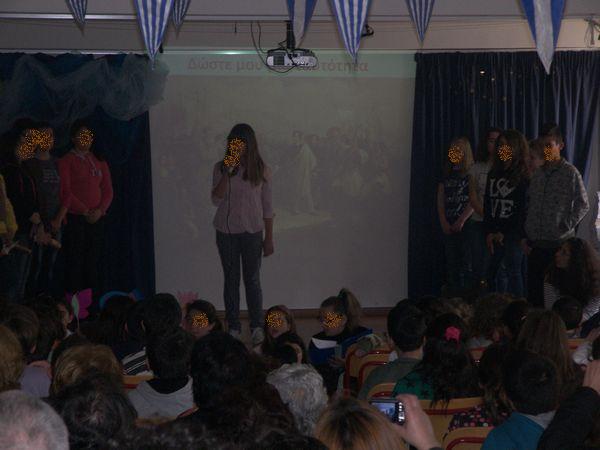 Η Στ’ τάξη παρουσιάσε σε γονείς και μαθητές το αφιέρωμα στην επανάσταση του 1821. Οι μαθητές τραγούδησαν και μίλησαν για τους ήρωες του 1821 αλλά και τις αξίες τους.