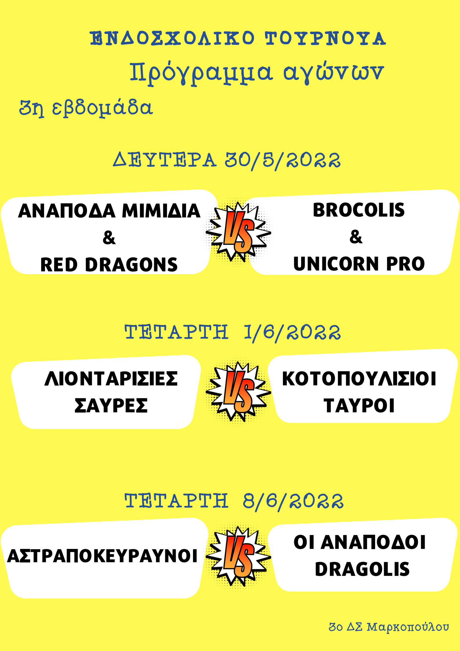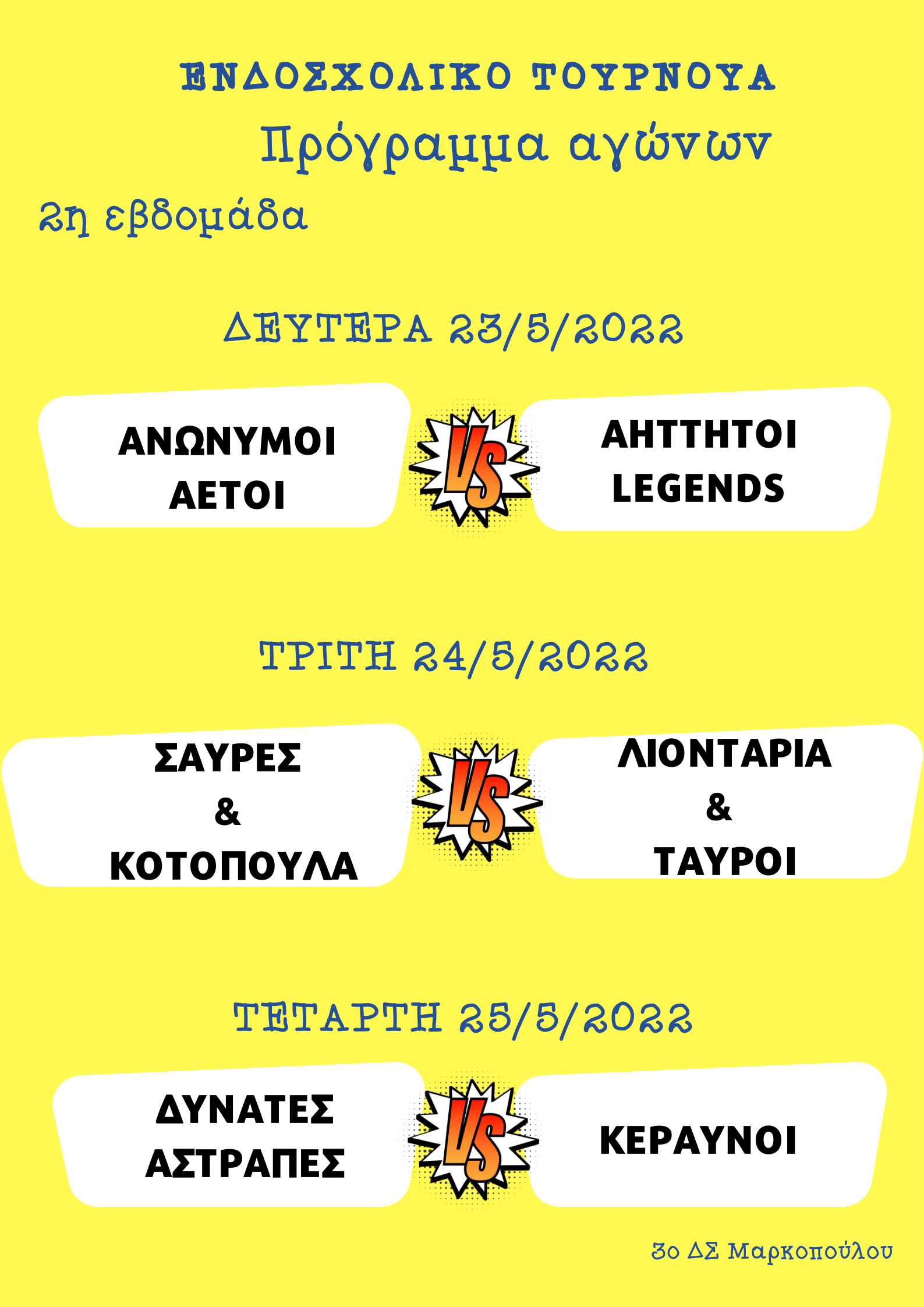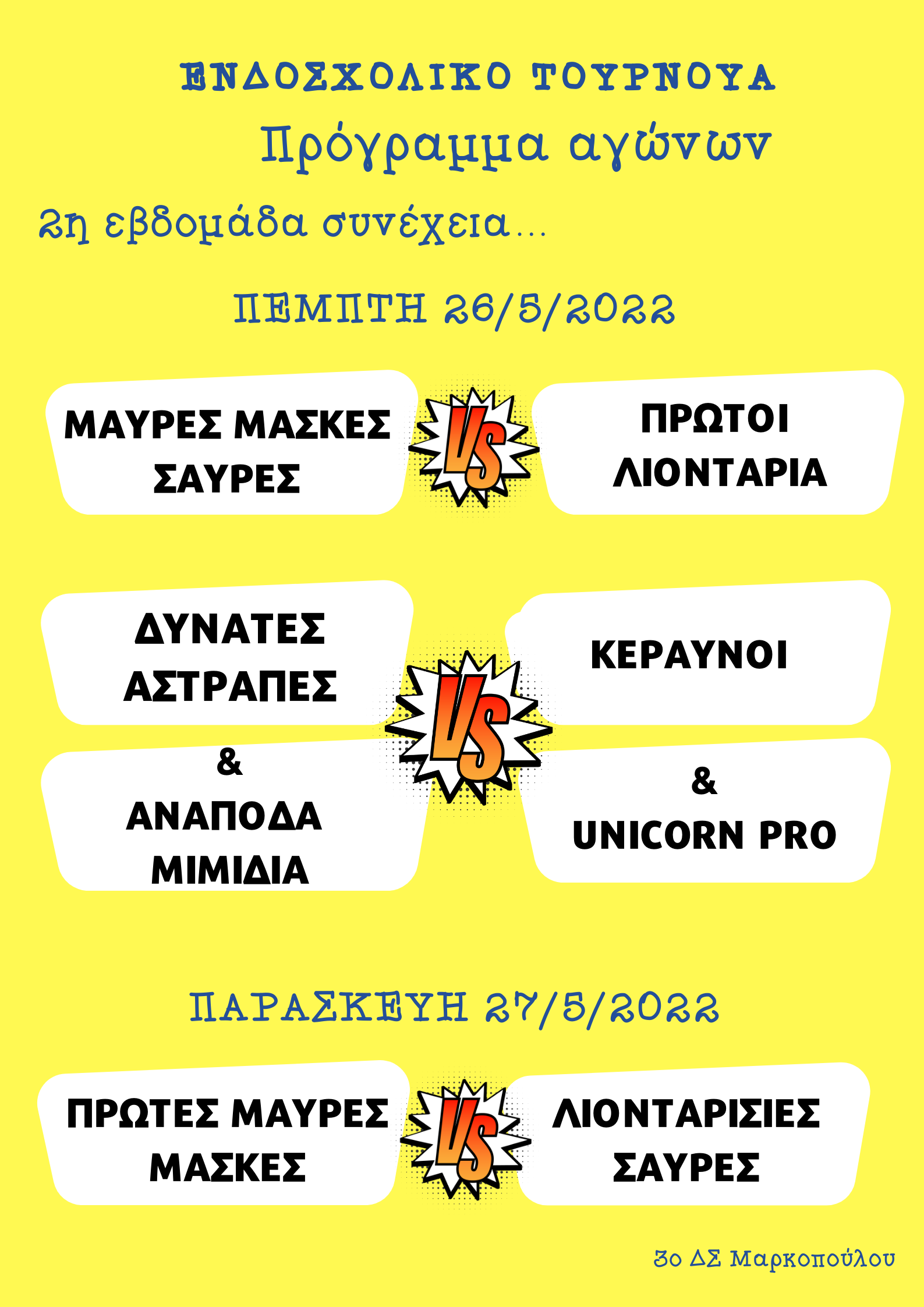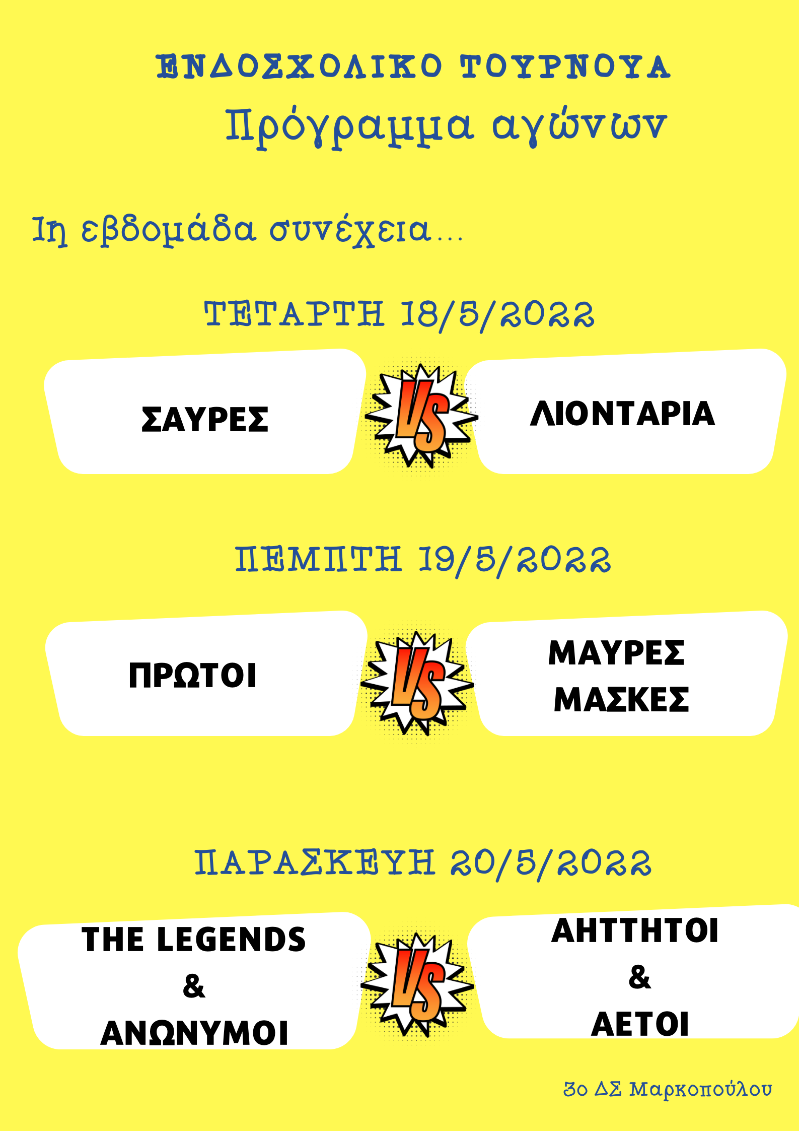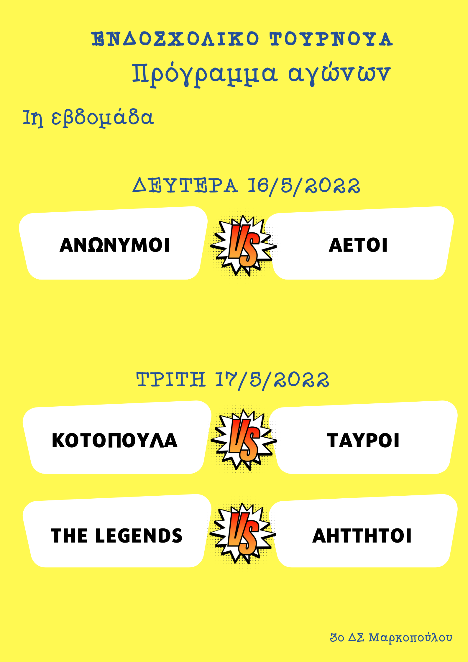 Δείτε παρακάτω το πρόγραμμα του τουρνουά. Καλή επιτυχία σε όλες τις ομάδες και καλή διασκέδαση!