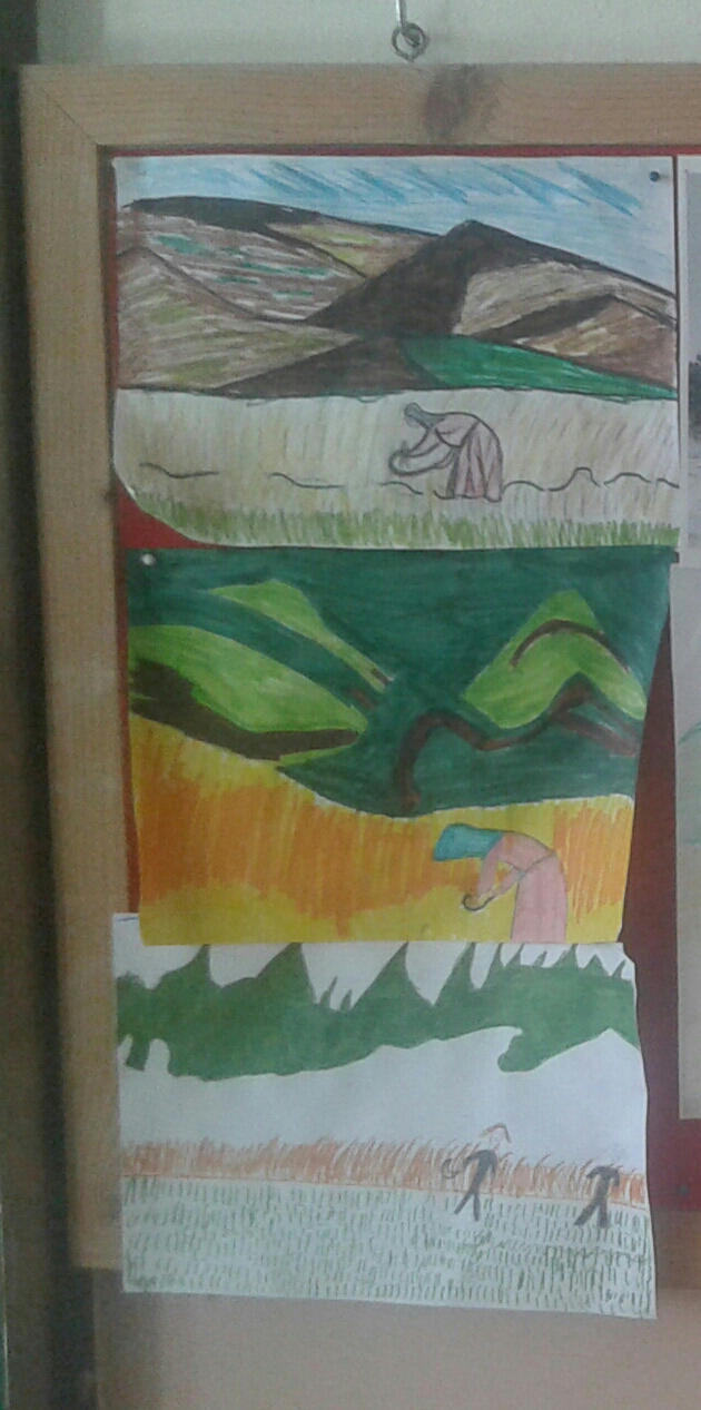 Με αφορμή την εικονογράφηση του μαθήματος “Καλοκαίρι με δρεπάνι, τσουγκράνα και αμίλητο νερό” οι μαθητές προσπάθησαν να αποδώσουν με το παιδικό τους χέρι τους πίνακες του Δ. Γιολδάση. Μπράβο παιδιά!
