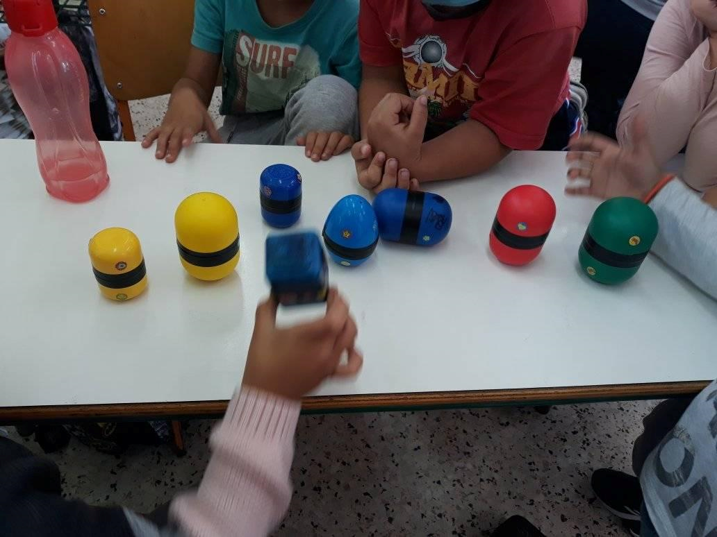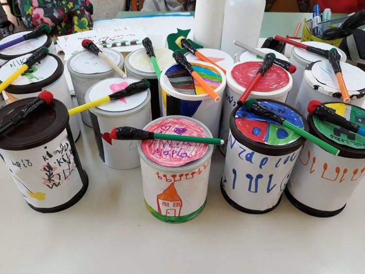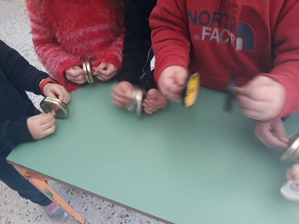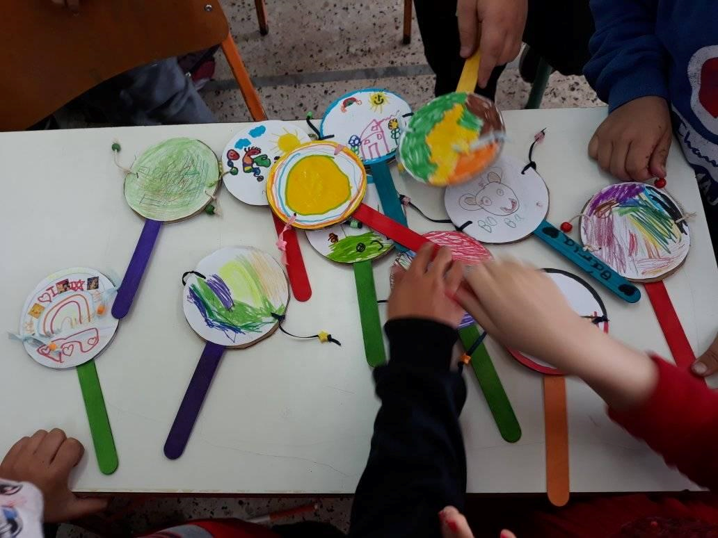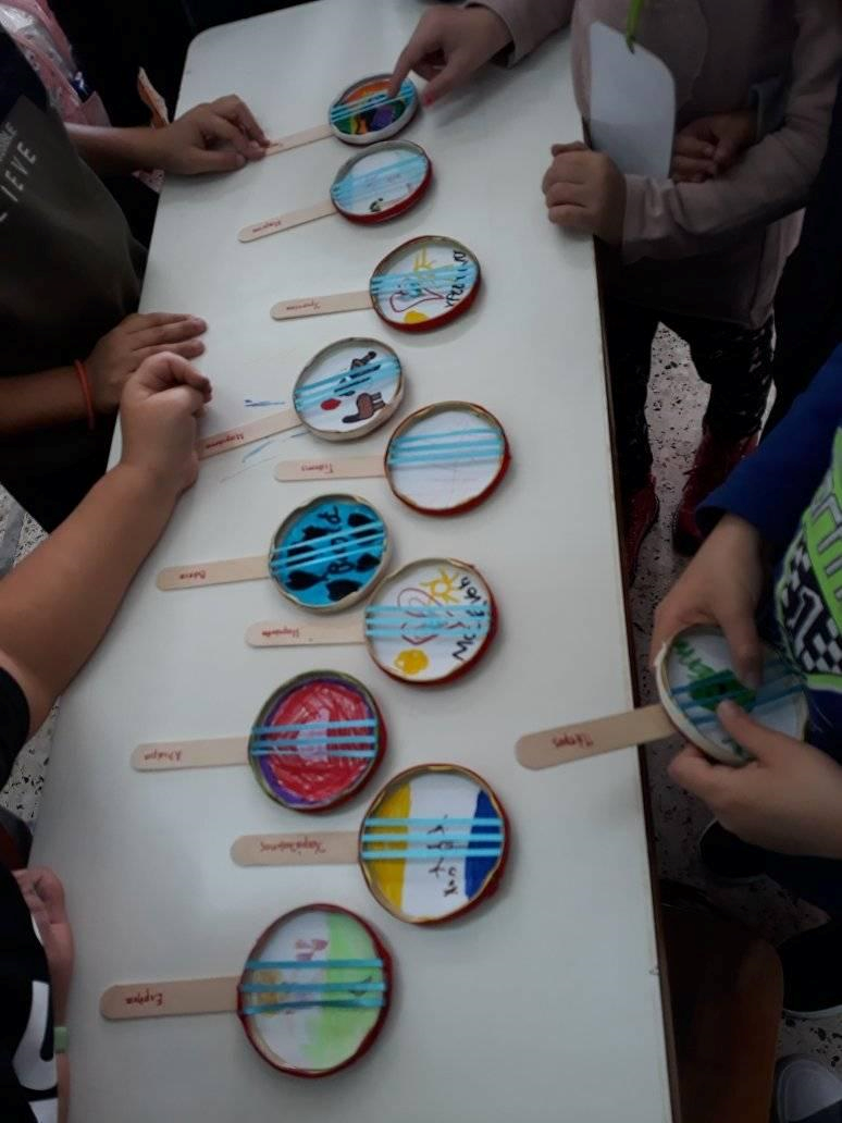 Με τους μαθητές της Α τάξης φτιάξαμε «μεμβρανόφωνα» τυμπανάκια με τις μπαγκέτες τους. Χρησιμοποιήσαμε σιδερένια κουτάκια, αφαιρέσαμε το πάνω μέρος και στη θέση του βάλαμε τεντωμένο μπαλόνι, σα μεμβράνη. Έφτιαξαν ζωγραφιές τις οποίες κολλήσαμε γύρω γύρω. Για μπαγκέτα χρησιμοποιήσαμε τους χαλασμένους μας μαρκαδόρους, στους οποίους τοποθετήσαμε στην άκρη κομματάκι τσόχας.