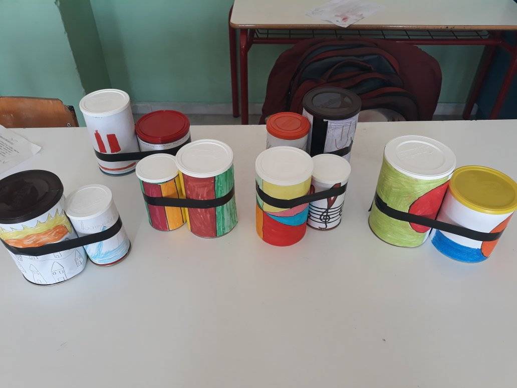 Με μεταλλικά κουτιά διαφόρων μεγεθών, φτιάξαμε σετ τυμπάνων τύπου bongos, με διαφορετική διάμετρο το καθένα, ώστε να παράγουν διαφορετικό ήχο.
