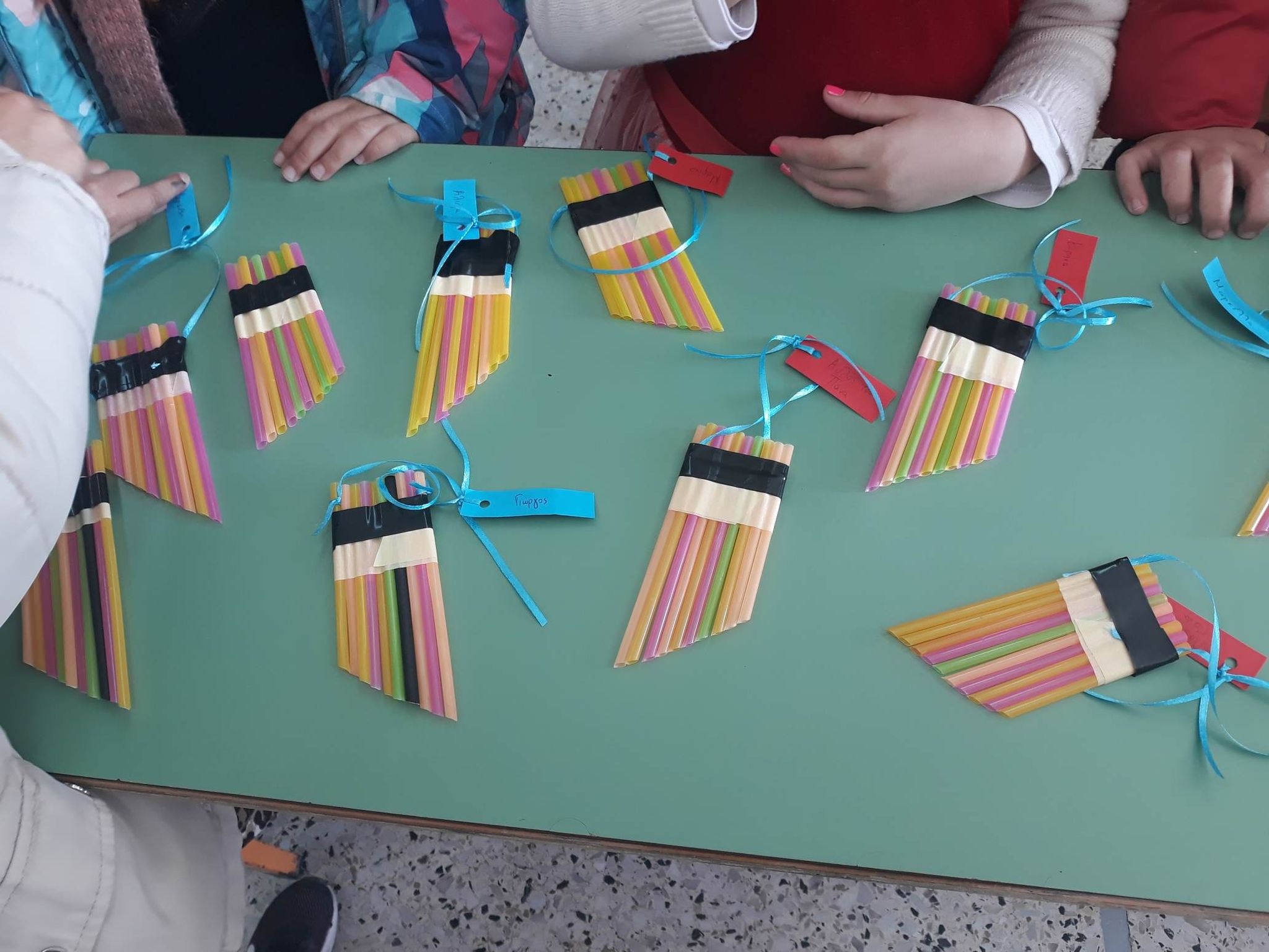 Με τους μαθητές της Α τάξης, κατασκευάσαμε ένα αερόφωνο όργανο αυτή τη φορά: τον Αυλό του Πάνα. Πλύναμε τα καλαμάκια μας, τα βάλαμε στη σειρά, τα κόψαμε, τα κολλήσαμε μεταξύ τους και ο αυλός του Πάνα ήταν έτοιμος.