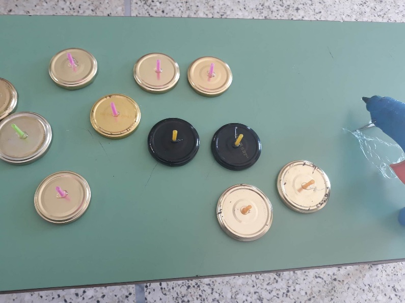 Να και η κατασκευή μας για μίνι πιατίνια. Το μόνο που χρειαστήκαμε ήταν καπάκια από βάζα, χαρτάκια με τις ζωγραφιές τους και μικρά κομματάκια από καλαμάκια για να τα χρησιμοποιήσουμε ως λαβή.