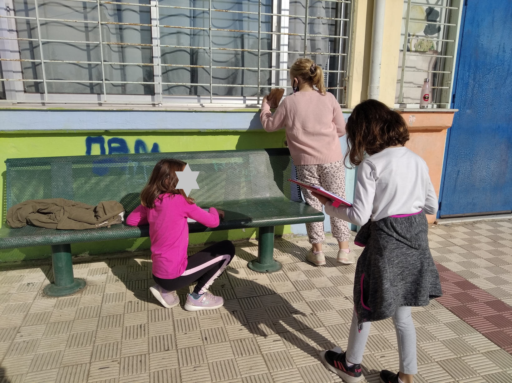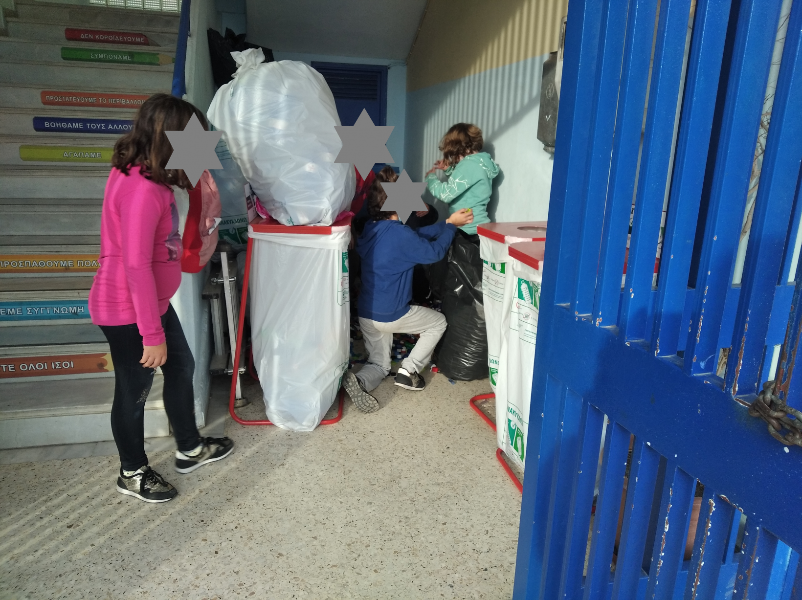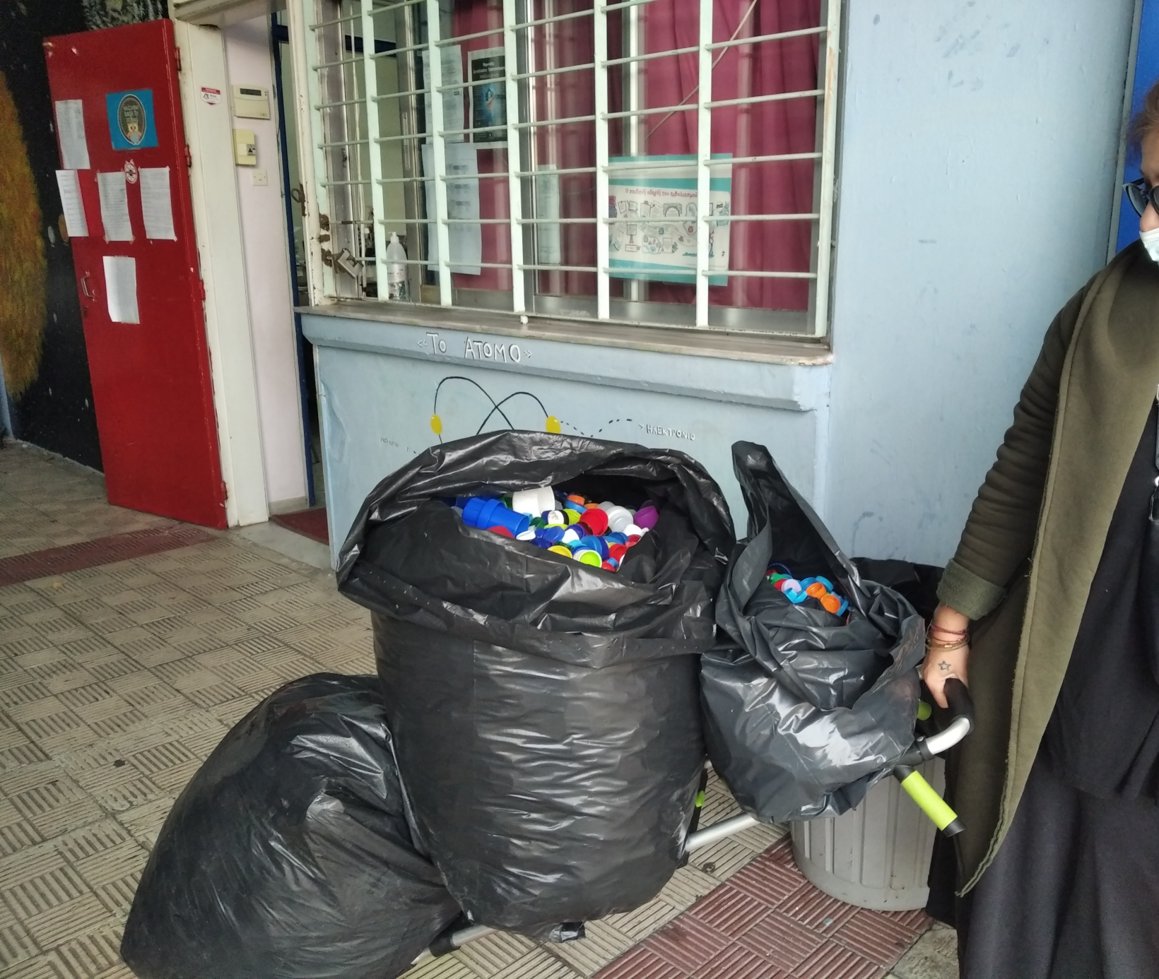 Τα παιδιά μεταφέρουν τα καπάκια από τον κάδο στις σακούλες, και στη συνέχεια η υπεύθυνη της επιχείρησης τα παραλαμβάνει: