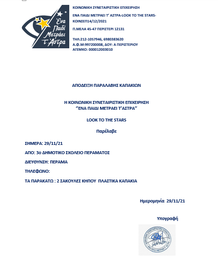 Οι μαθητές του σχολείου μας κατάφεραν να συγκεντρώσουν πλαστικά καπάκια, δύο μεγάλες σακούλες κήπου, ώστε να τα συνεισφέρουν στην κοινωνική συνεταιριστική επιχείρηση “Ένα παιδί μετράει τ’ άστρα” – Look to the stars” και έτσι να μπορέσει να αγοραστεί ένα αναπηρικό αμαξίδιο για παιδιά που το έχουν ανάγκη.