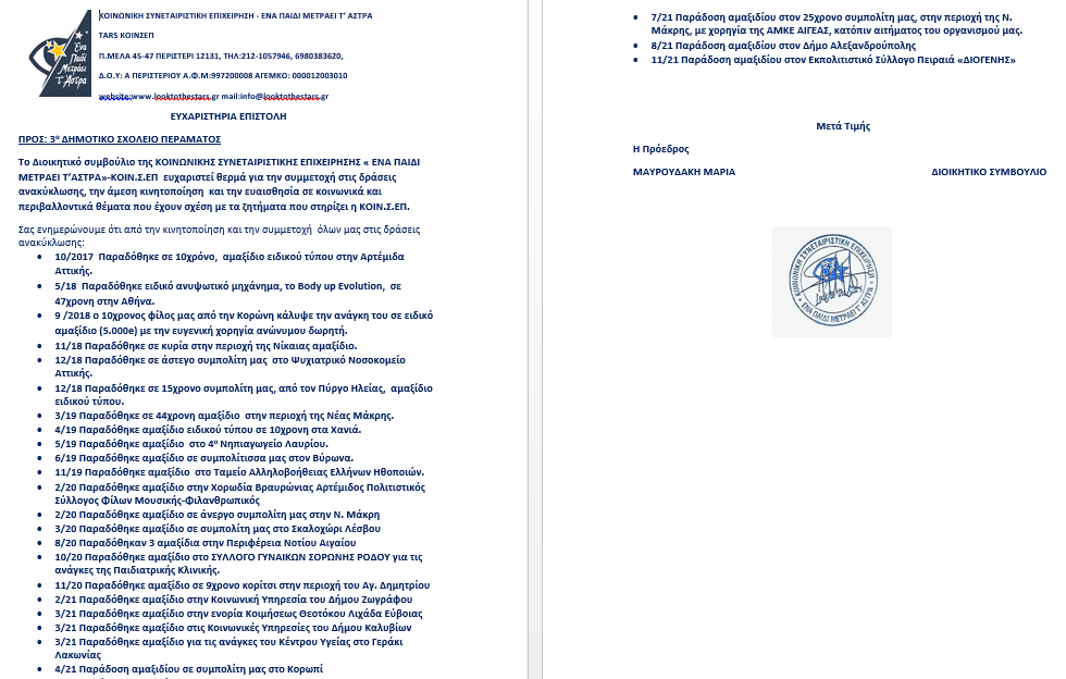 Τέλος, λάβαμε ευχαριστήρια επιστολή για την περισυλλογή των καπακιών!