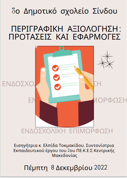 - Διαδικτυακή επιμορφωτική συνάντηση με εισηγήτρια την Σ.Ε.Ε πε70 του 20υ ΠΕΚΕΣ Κεντρικής Μακεδονίας κ. Τοκμακίδου και συμμετοχή των εκπαιδευτικών του σχολείου μας κ. Ζούζουλα Αικατερίνη και κ. Ποτοσάκη Μαρία- Μάρθα με θέμα: «Περιγραφική Αξιολόγηση: Προτάσεις και Εφαρμογές» (8/12/2022)