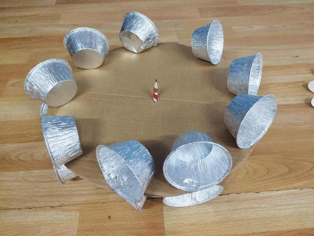 Με χαρτόνι από τα χαρτοκουτα από τα ψωμάκια και κουπάκια ( θα μπορούσαν να χρησιμοποιηθούν ποτήρια μιας χρήσης και πιάτο μιας χρήσης ή και το δισκάκι της τούρτας).
