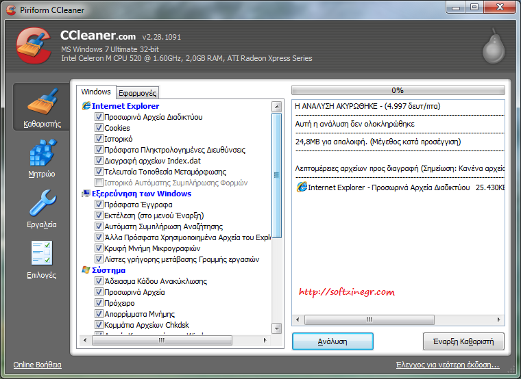 Η λειτουργία του προγράμματος είναι να εντοπίζει και να αφαιρεί αρχεία ή τμήματα πληροφοριών πρόσφατα χρησιμοποιημένων: cookies, αρχεία πλοήγησης, προσωρινά αρχεία και άλλα.