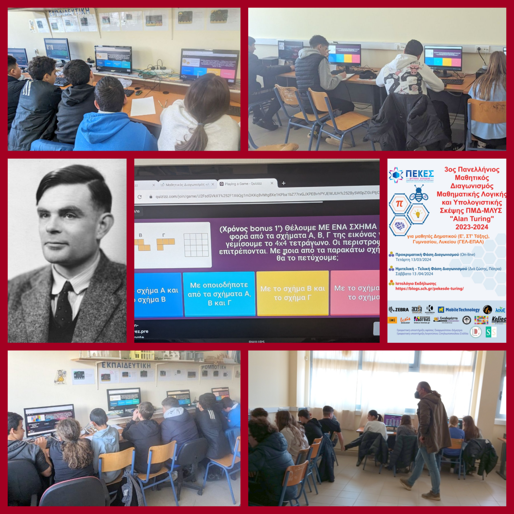 Σήμερα, Τετάρτη, 13 Μαρτίου 2024, αρκετοί μαθητές και μαθήτριες του Σχολείου μας συμμετείχαν στην προκριματική φάση του 3ου Πανελλήνιου Μαθητικού Διαγωνισμού Μαθηματικής Λογικής και Υπολογιστικής Σκέψης Alan Turing 2023-24.