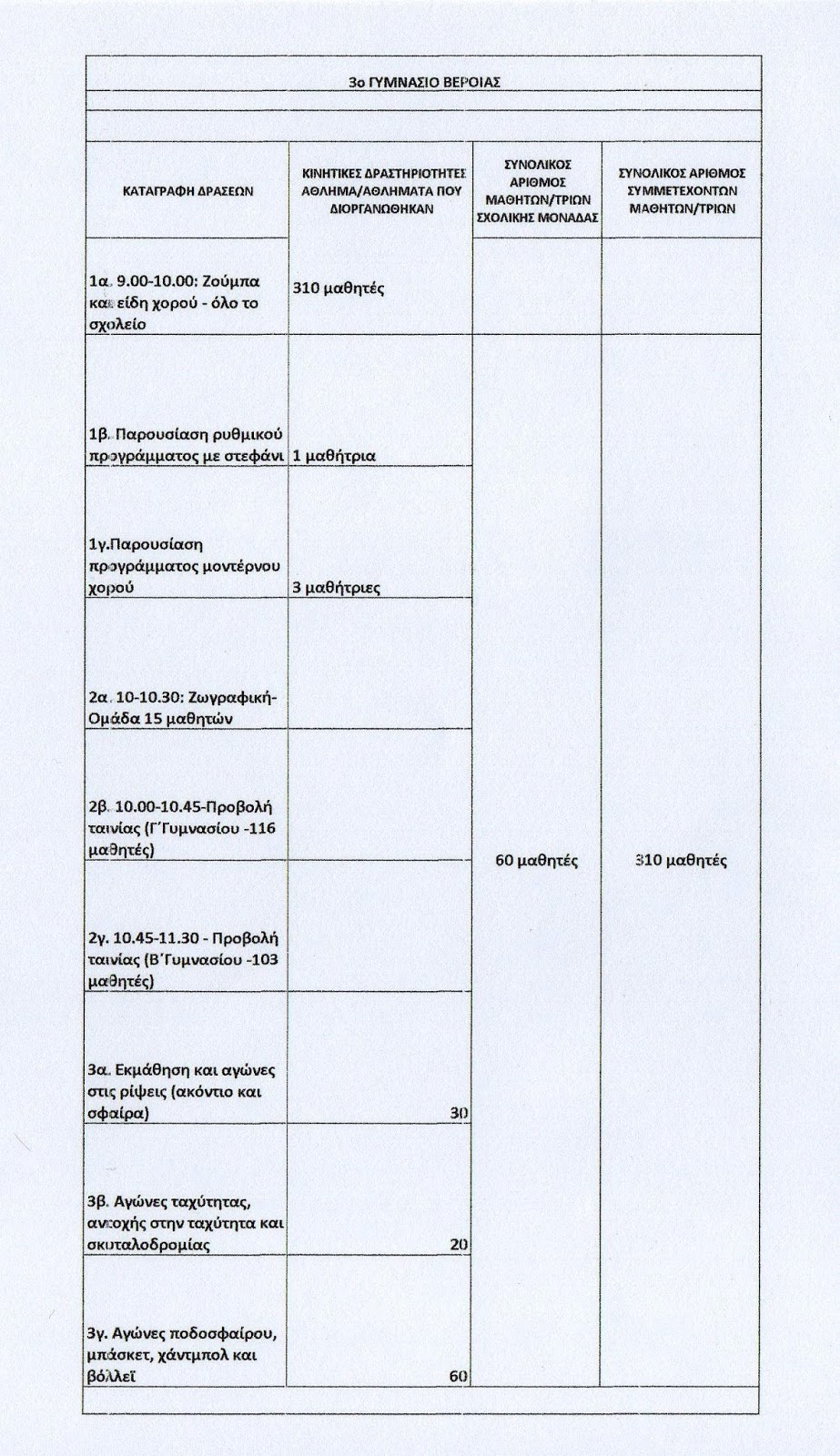 Διοργανώθηκε στο σχολείο μας στις 3 Οκτωβρίου 2016 η Ημέρα Σχολικού Αθλητισμού με θέμα «Νοιώσε τη χαρά της άθλησης χωρίς το άγχος της νίκης και το φόβο της αποτυχίας: Αθλητισμός- Δικαίωμα για όλους» Δίπλα υπάρχει το πρόγραμμα των εκδηλώσεων και παρακάτω κάποιες φωτογραφίες