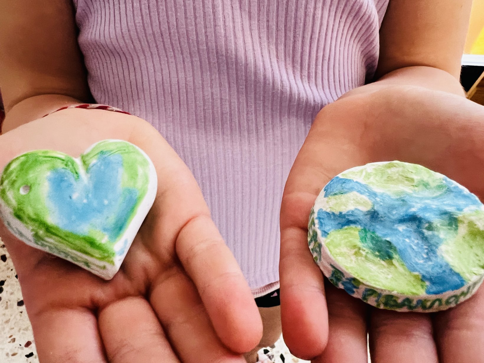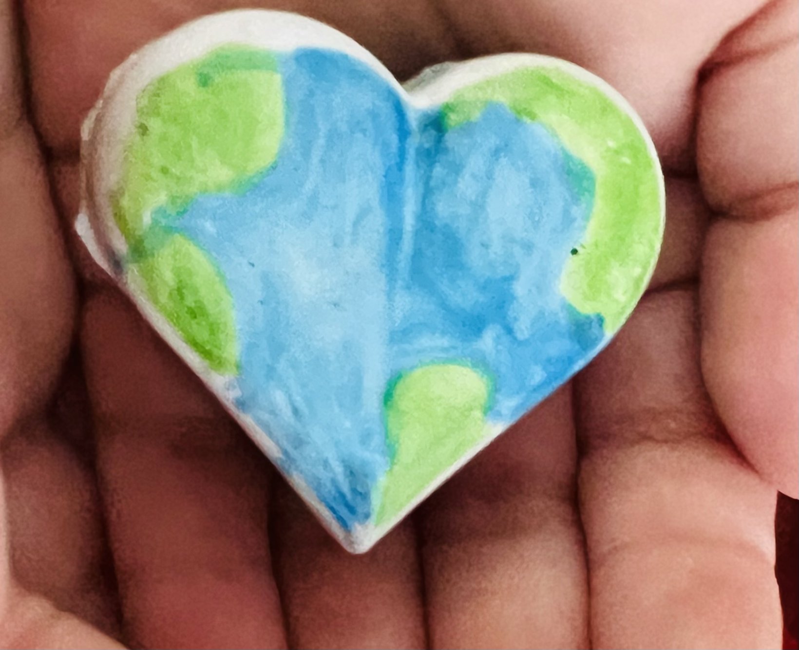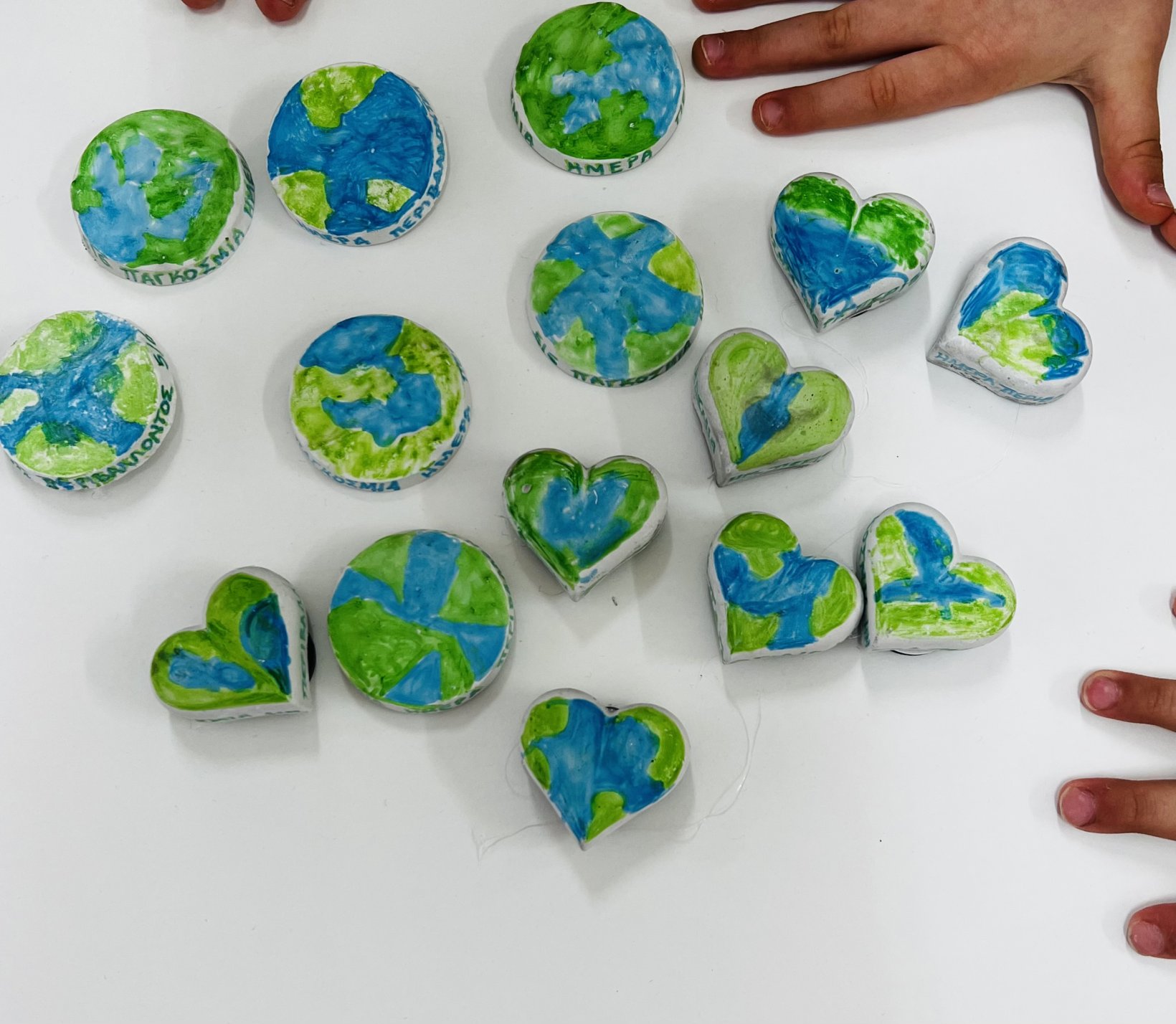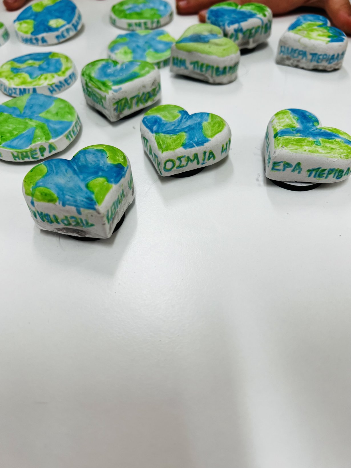 Με μικρά χεράκια και μεγάλες καρδιές, φτιάξαμε μαγνητάκια από καλλιτεχνικό γύψο 💫 — σε σχήμα καρδιάς και κύκλου — και τα ζωγραφίσαμε στα χρώματα του πλανήτη μας 💙💚 γιατί η Γη είναι η καρδιά μας! ❤️🌍