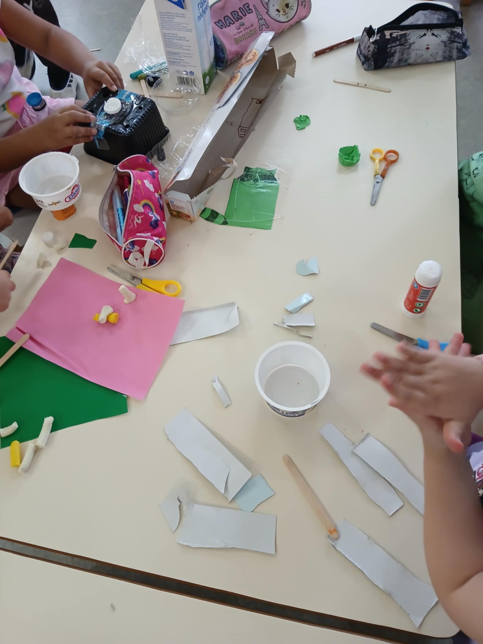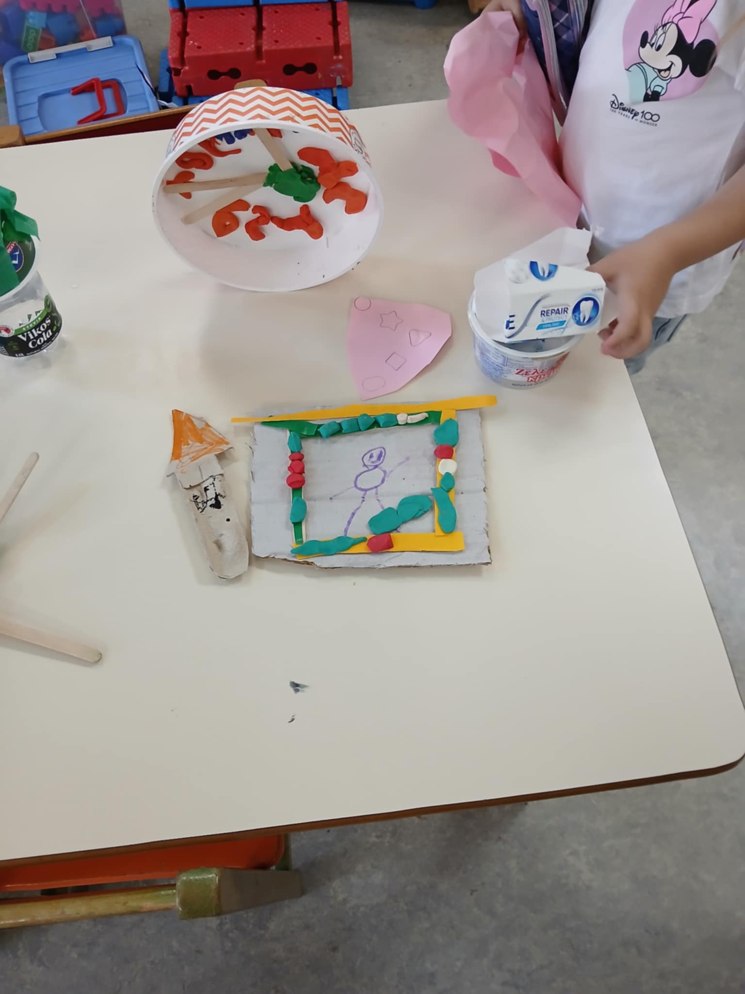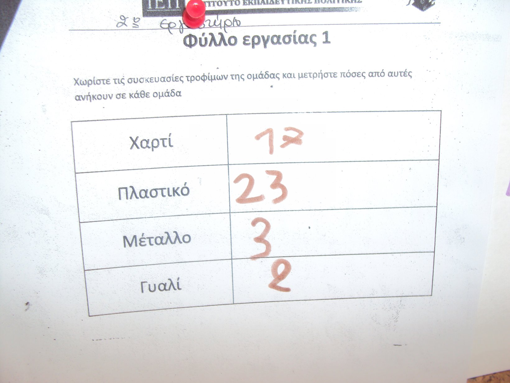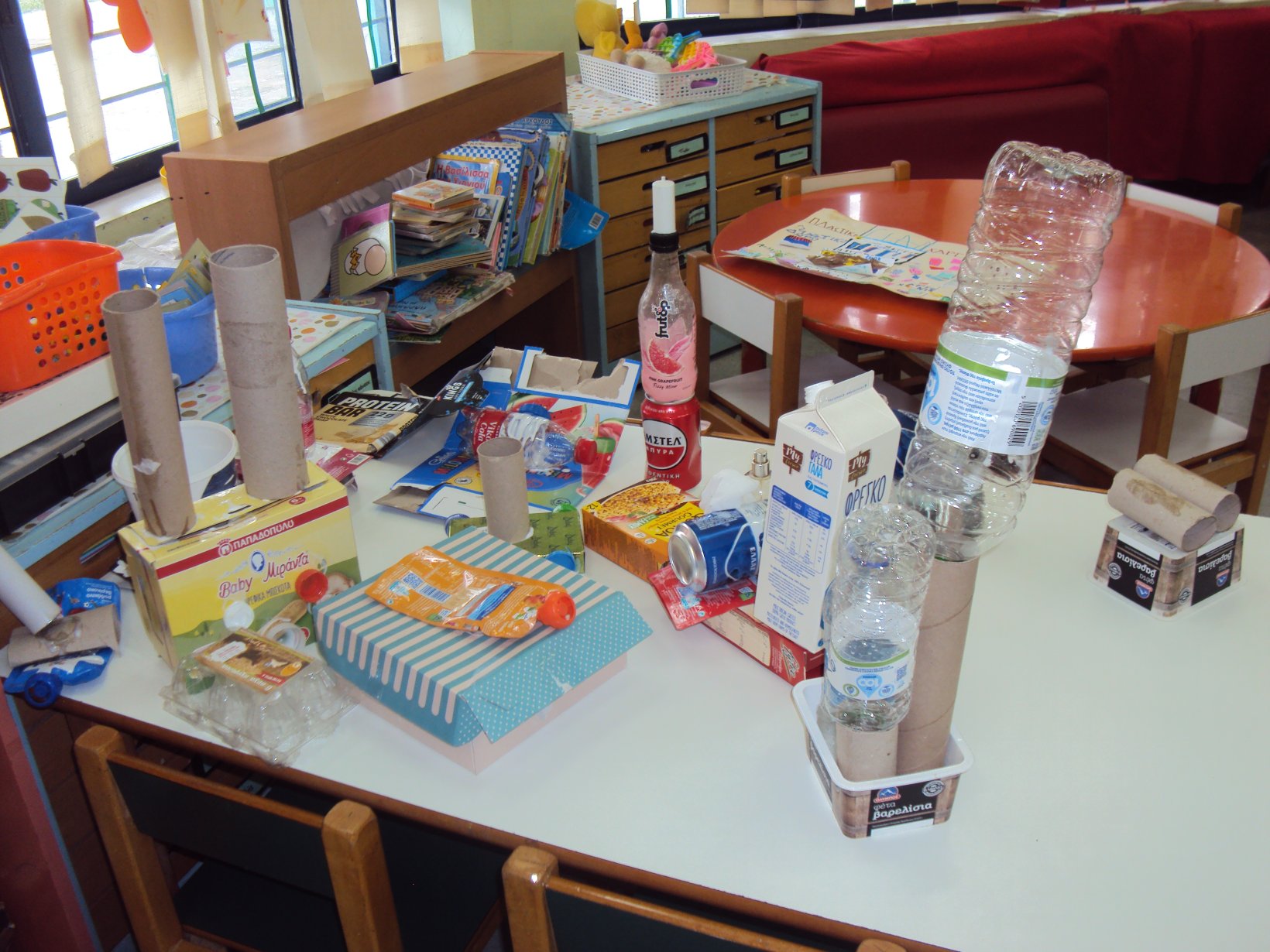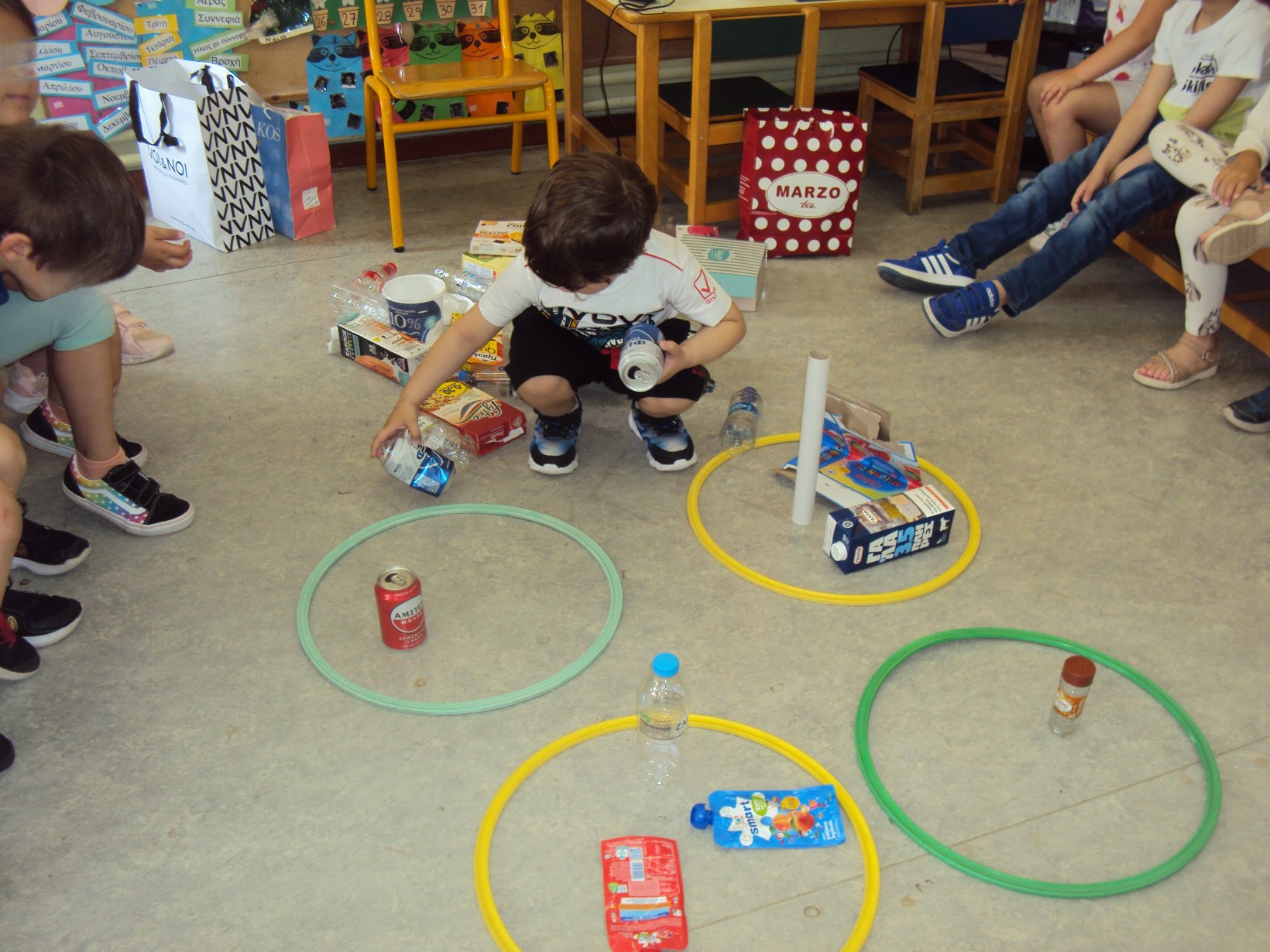 Τα μετρήσαμε και μετά αναζητήσαμε μέσα στο χώρο του νηπιαγωγείου αντικείμενα από ανακυκλώσιμα υλικά. Τα παιδιά τα ζωγράφισαν και τα ομαδοποίησαν.