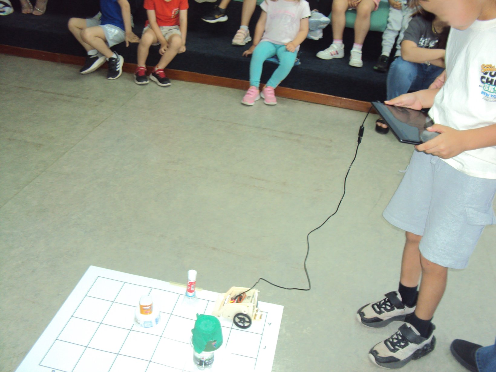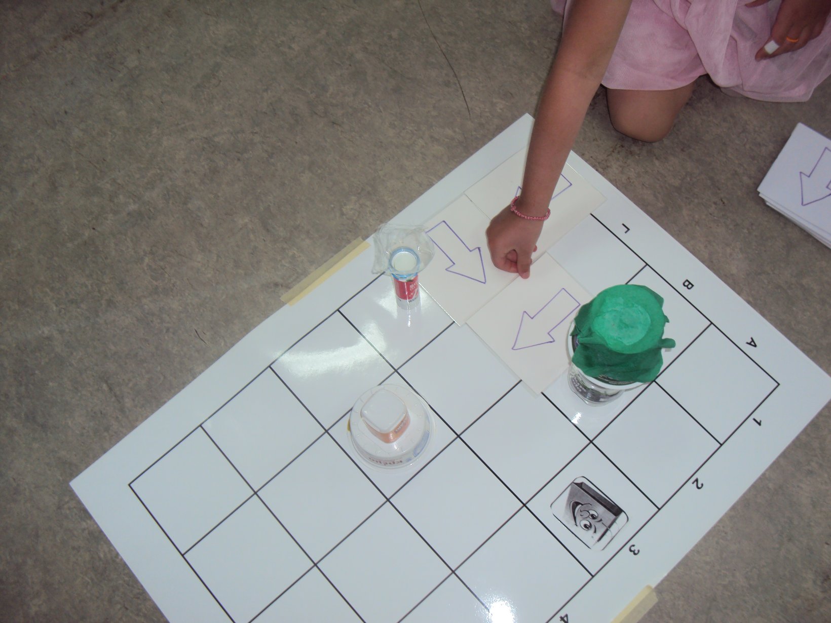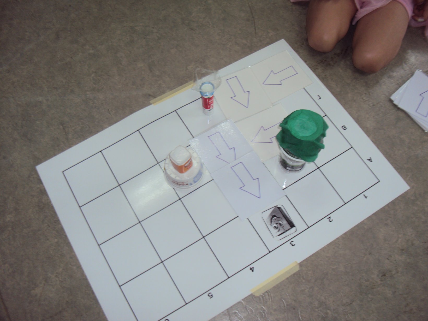 Από την αυλή περάσαμε στην καθοδήγηση ενός ρομπότ σε ετοιμο ταμπλό με εμπόδια που φτιάχτηκαν σε προηγούμενο στάδιο από τα παιδιά.Αρχικά υπήρχε αναπαράσταση της διαδρομής  ανάμεσα στα εμπόδια με κάρτες με βέλη.
